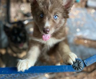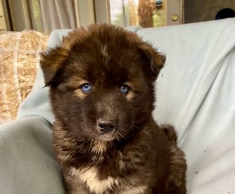 Siberian Husky puppies include black tan and white, sable and white, red and white, black and white, and agouti and white. Pomeranian puppies include chocolate, chocolate merle, and blue merle. Colors will vary depending on the parent dogs.