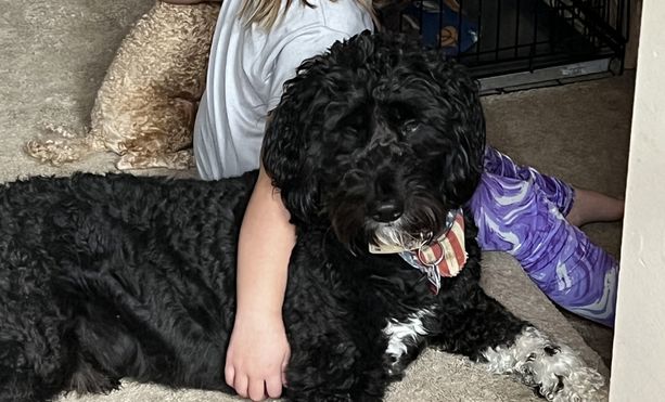Mac is a black F1 golden doodle with white spots. He is very lovable, always by your side, tons of energy and super smart.