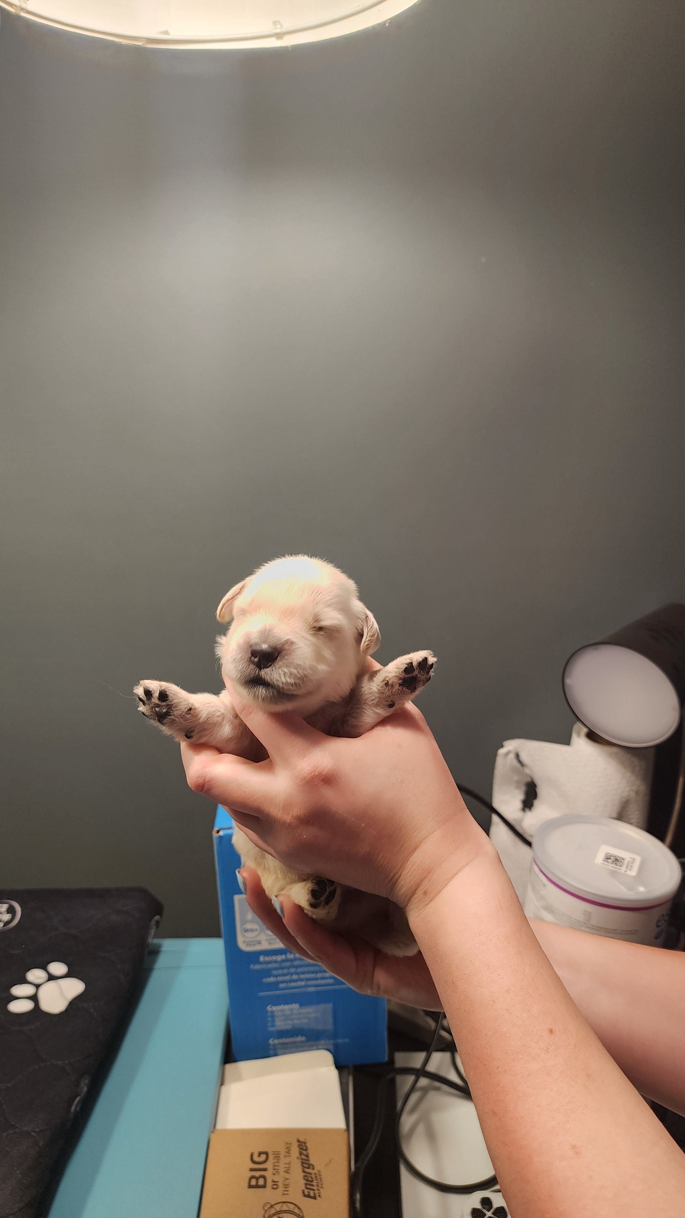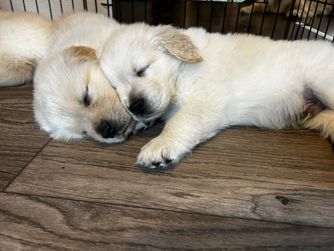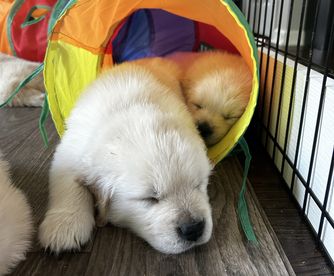 Our Golden Retriever puppies are golden. Havanese puppies include black and white, white, cream, black, and black and tan. Colors will vary depending on the parent dogs.