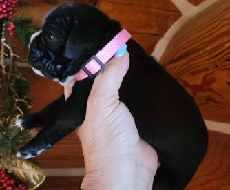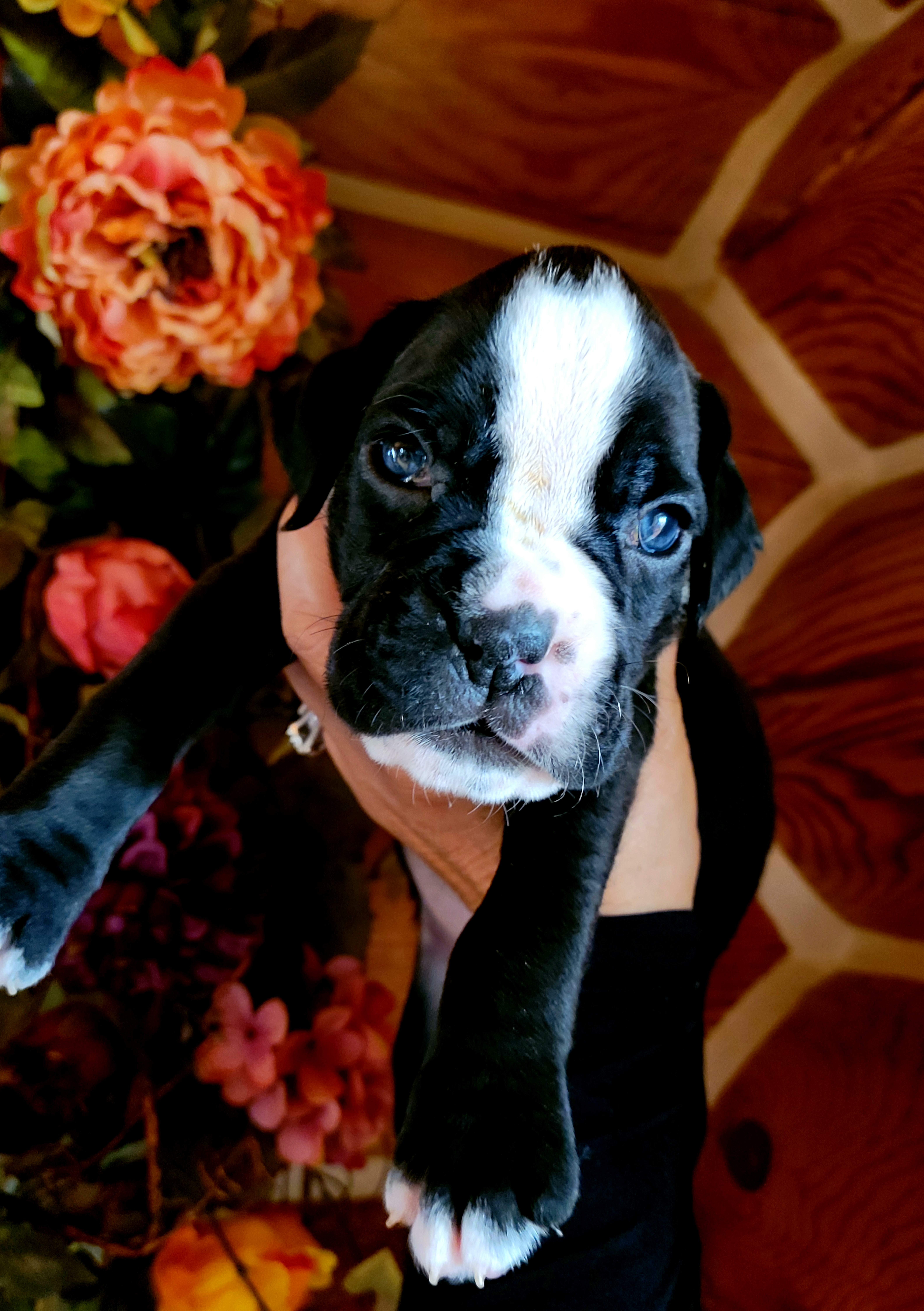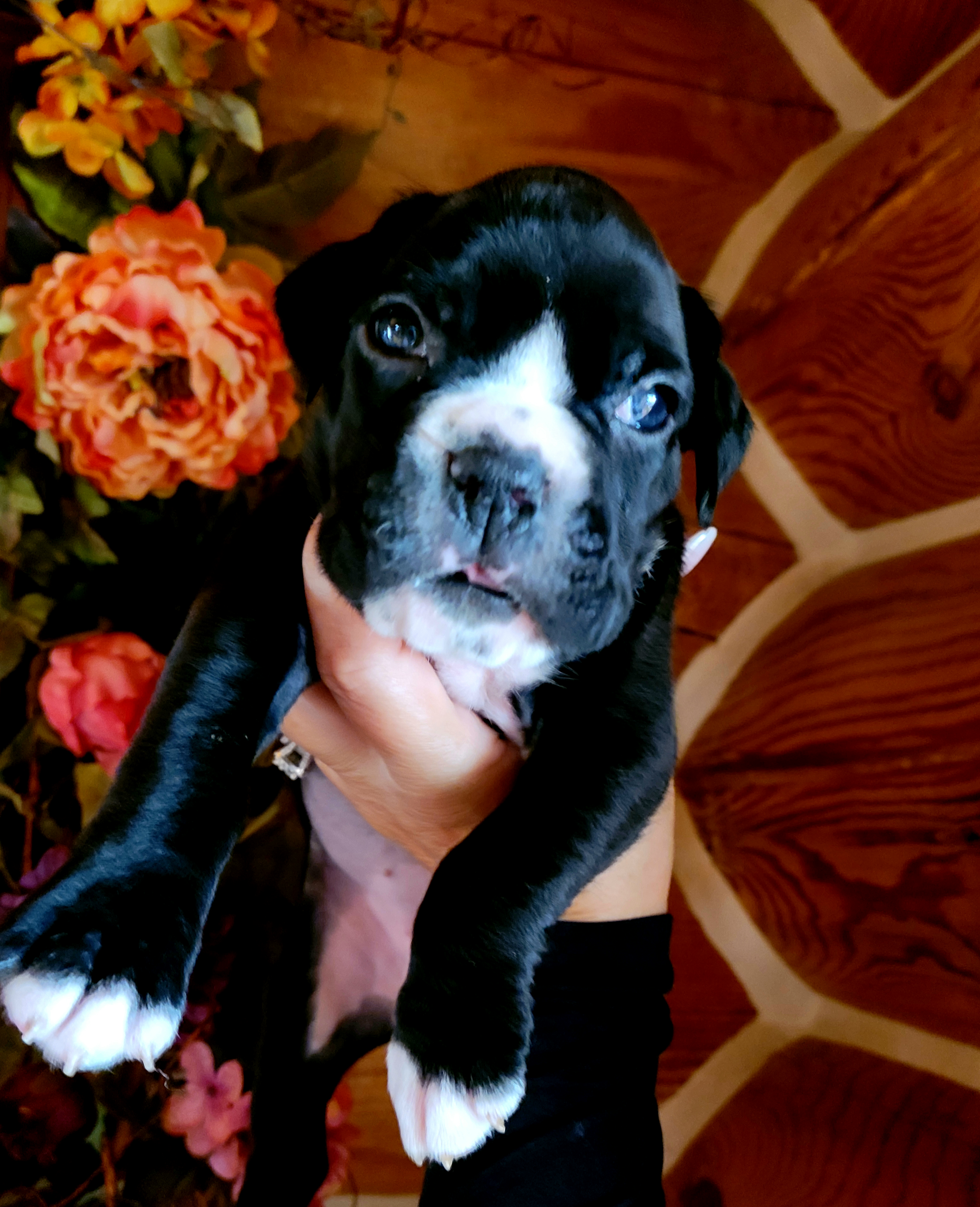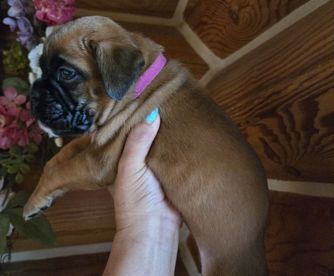 A well-rounded boxer female from health, disposition, and beauty. Her pedigree includes Firework De Porta Village and Urpaniel Fender Edda, champion pedigrees.