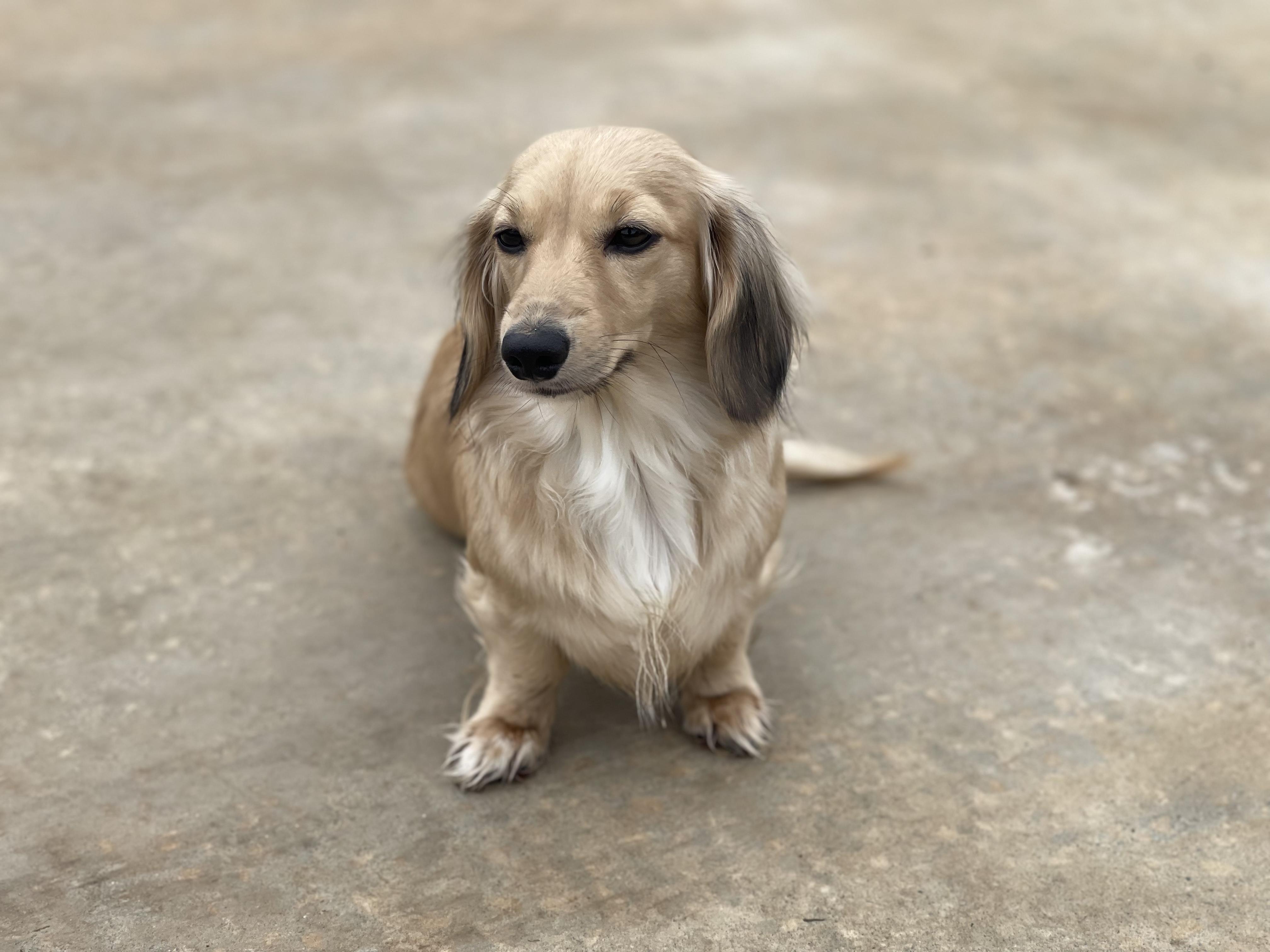 Olive is a long coat Shaded cream mini Doxie weighing 11lbs fully grown.
