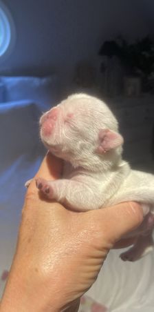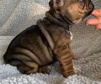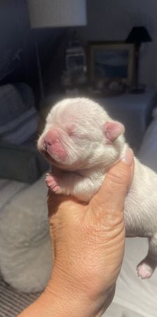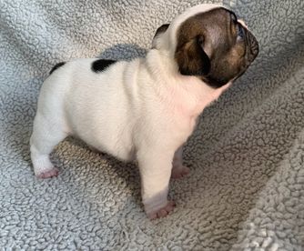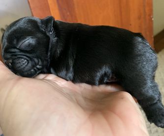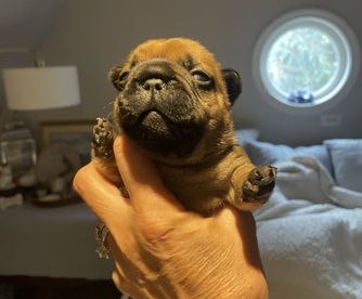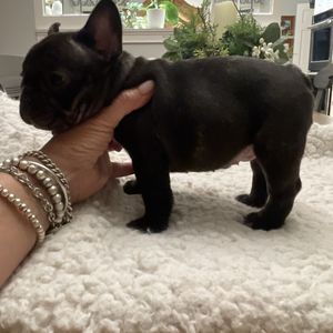This adorable little girl is such a fun and joyful Frenchie. Loves other dogs, people and food. Built small and compact with a beautiful headpiece and lots of wrinkles.