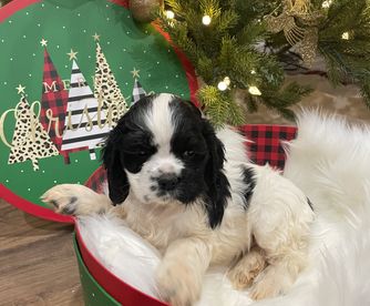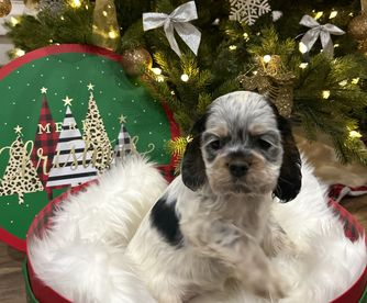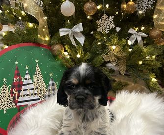 Our Cocker Spaniel puppies include brown roan, blue roan, blue roan and tan, and black and white. Cockapoo puppies include buff and red. Colors will vary depending on the parent dogs.