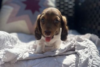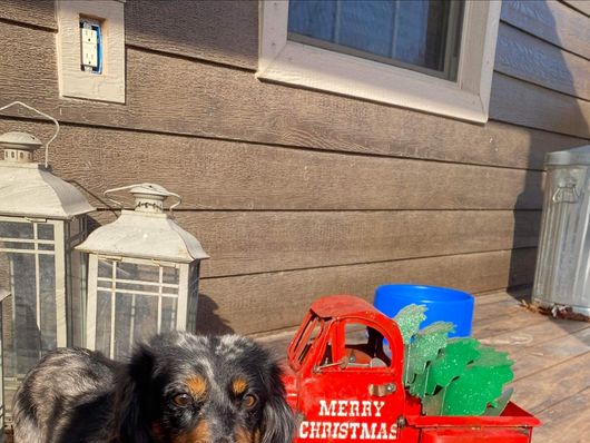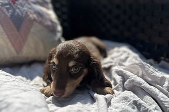 Maple is a beautiful chocolate and tan longhair miniature dachshund. She is the calmest, sweetest girl. She is AKC registered. She is raised in our home around other animals, and children.