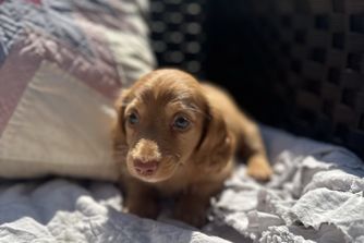 Odie is a beautiful cream longhair dachshund. He is AKC registered. He loves to go on walks, and play. He is raised on our farm with other animals and our children!