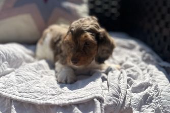 Willie is a gentle, calm, sweet, longhair miniature dachshund. He loves snuggling, and being a couch potato! He is APRI registered.