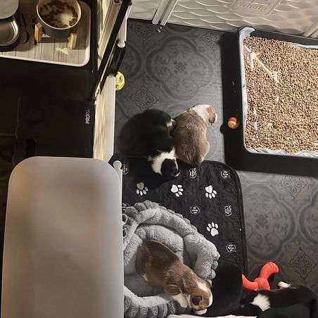 ✨Puppies have been working on litter training this week. As soon as we get that down we will be taking out the whelping box and letting them have a big play area with a slide🛝 as well as more toys 🎾to play with! They are doing great and have only been introduced to it for a few days now. Waiting for their water and food feeders to come in for their big play pen and they will be set. Just a little bit longer in the whelping box to go to learn the litter training. This will help jumpstart potty training for future families! Growing so fast! 💟