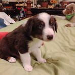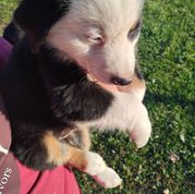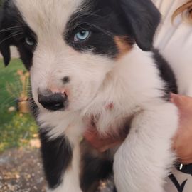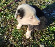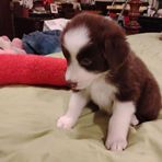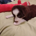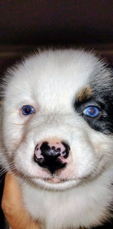 Five beautiful puppies left. They're coming along nicely. Alll coming into their own personalities. One female four male. The second picture black tri with the little snip on our nose, is the female. She has dark eyes. Three of the males have bright blue eyes. One has one blue eye and one amber.