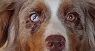 Red Merle. 1 Blue Eye, 1 Amber Eye. Loves to swim, play with the other dogs and dote over her puppies.