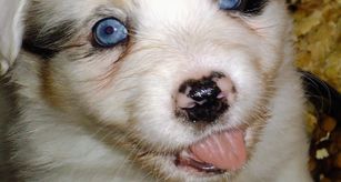 Red Merle. 1 Blue Eye with Amber Line, 1 Amber Eye