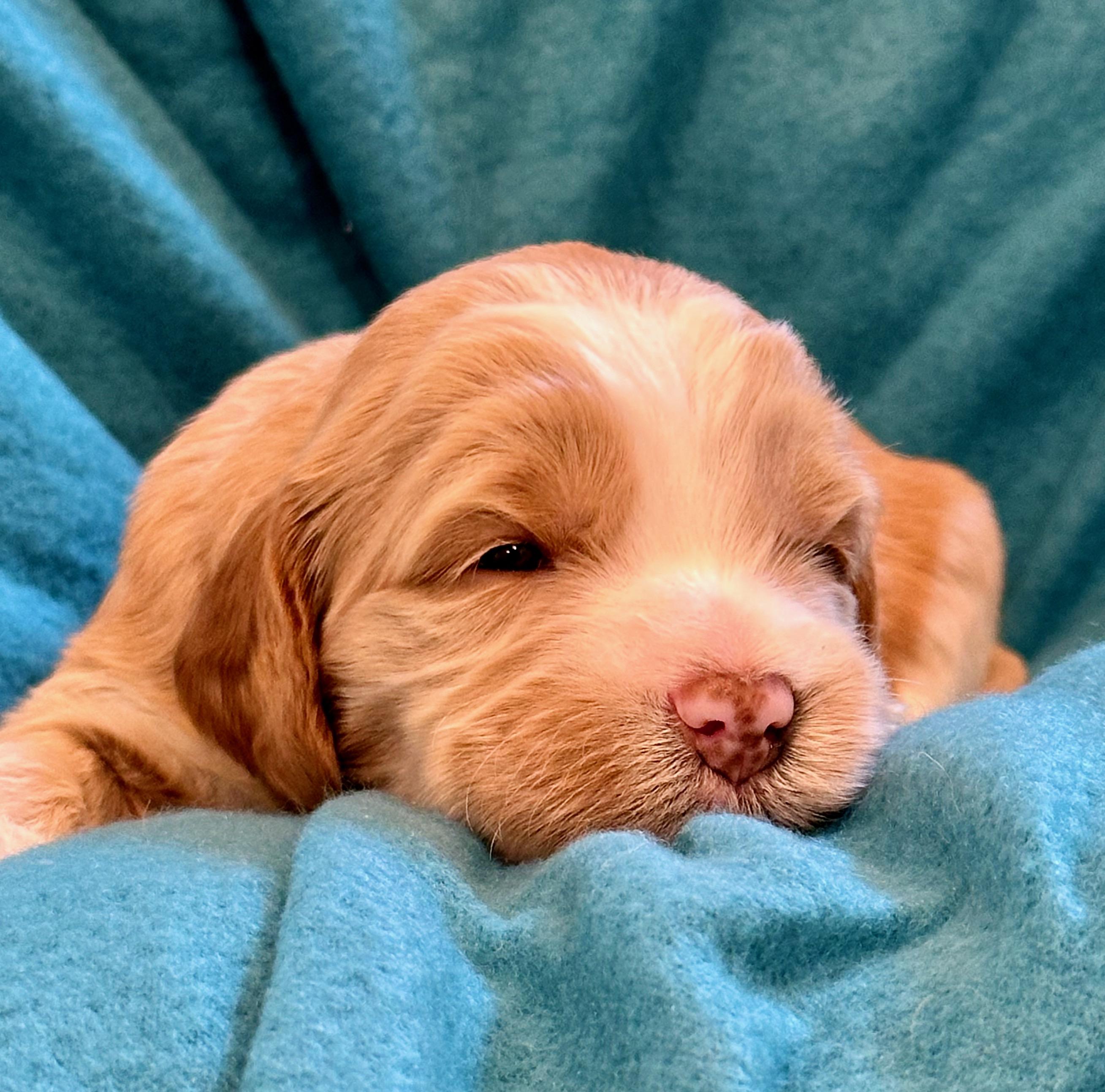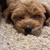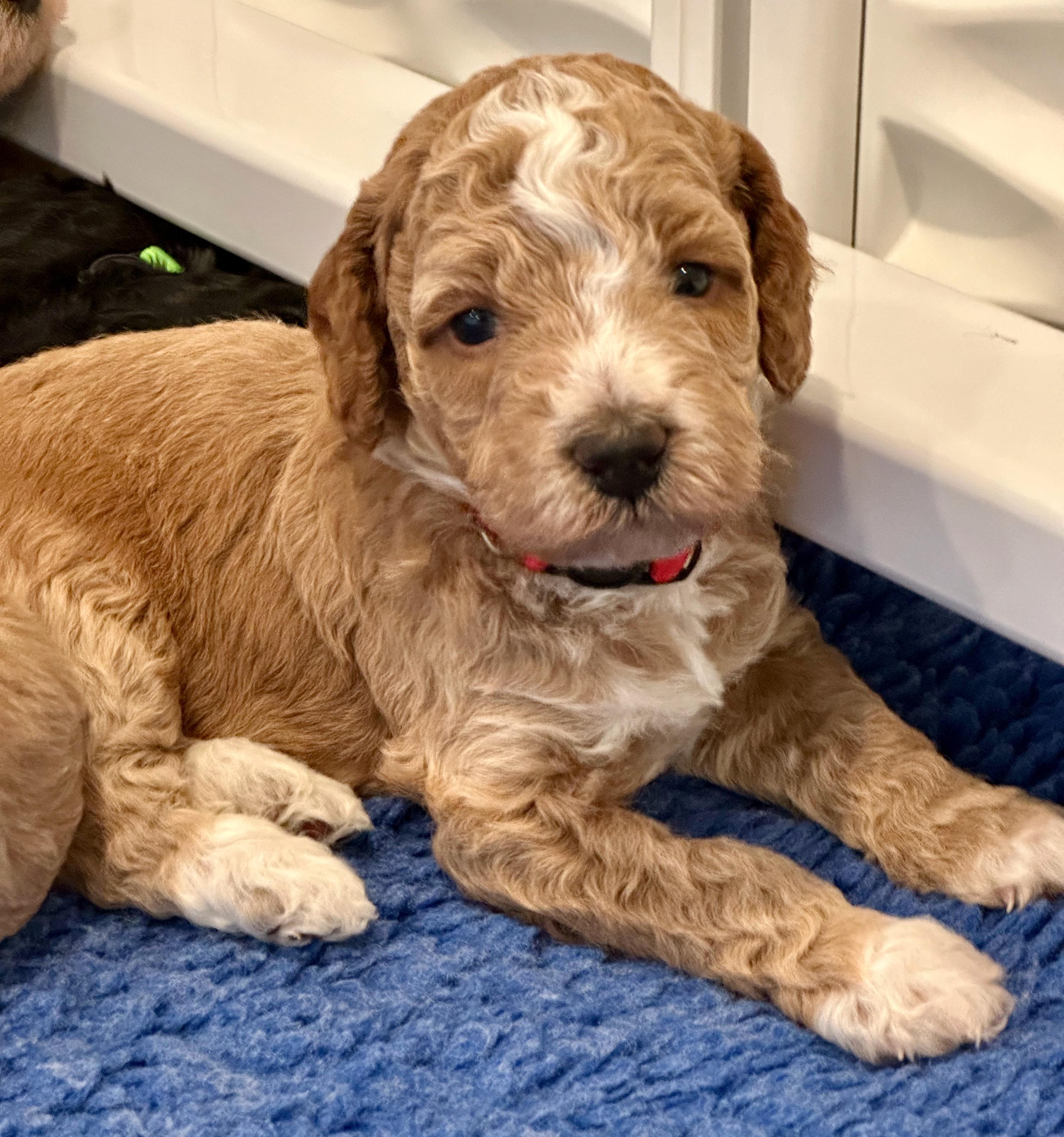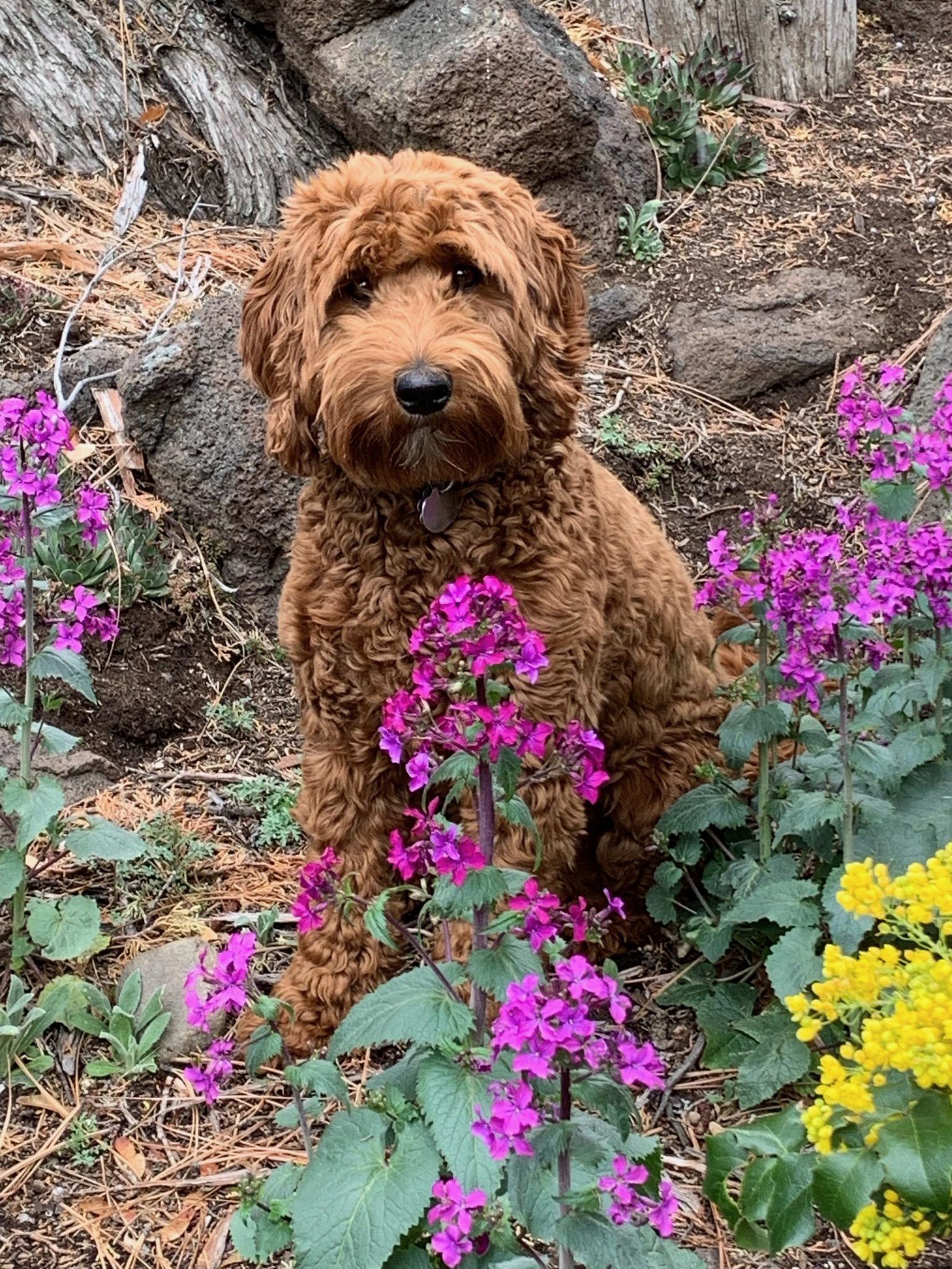 Everyone wants a dog like Rue! She's smart, sweet , and athletic with a warm, gentle personality and a gaze that melts your heart. She's cute as they come! Rue is our smallest with a wonderful red fleece non-shedding coat. Her kind and generous guardian family involve Rue in all of their activities from road trips to camping to playing at the beach. Rue’s family adore her affectionate, sweet personality.