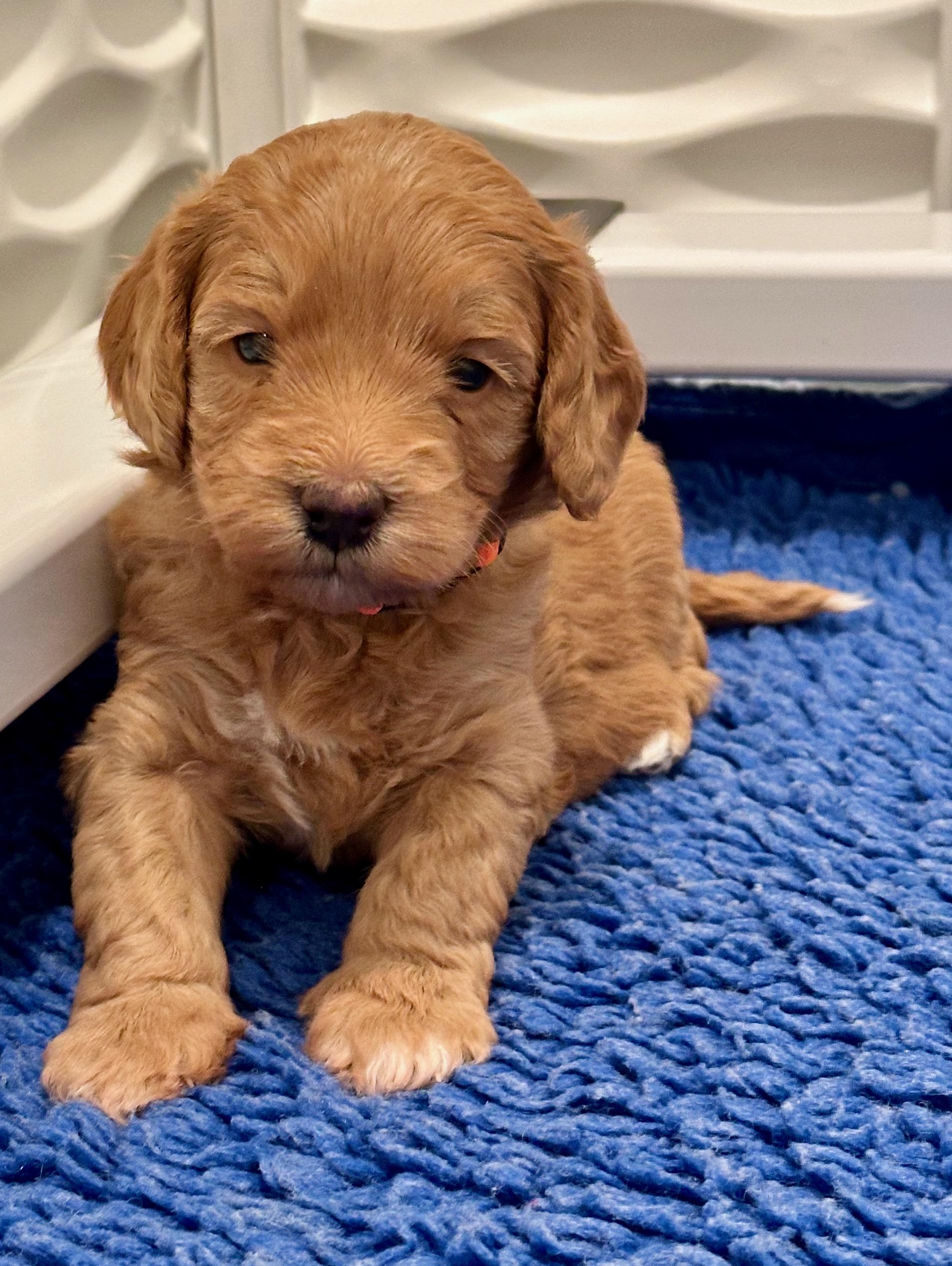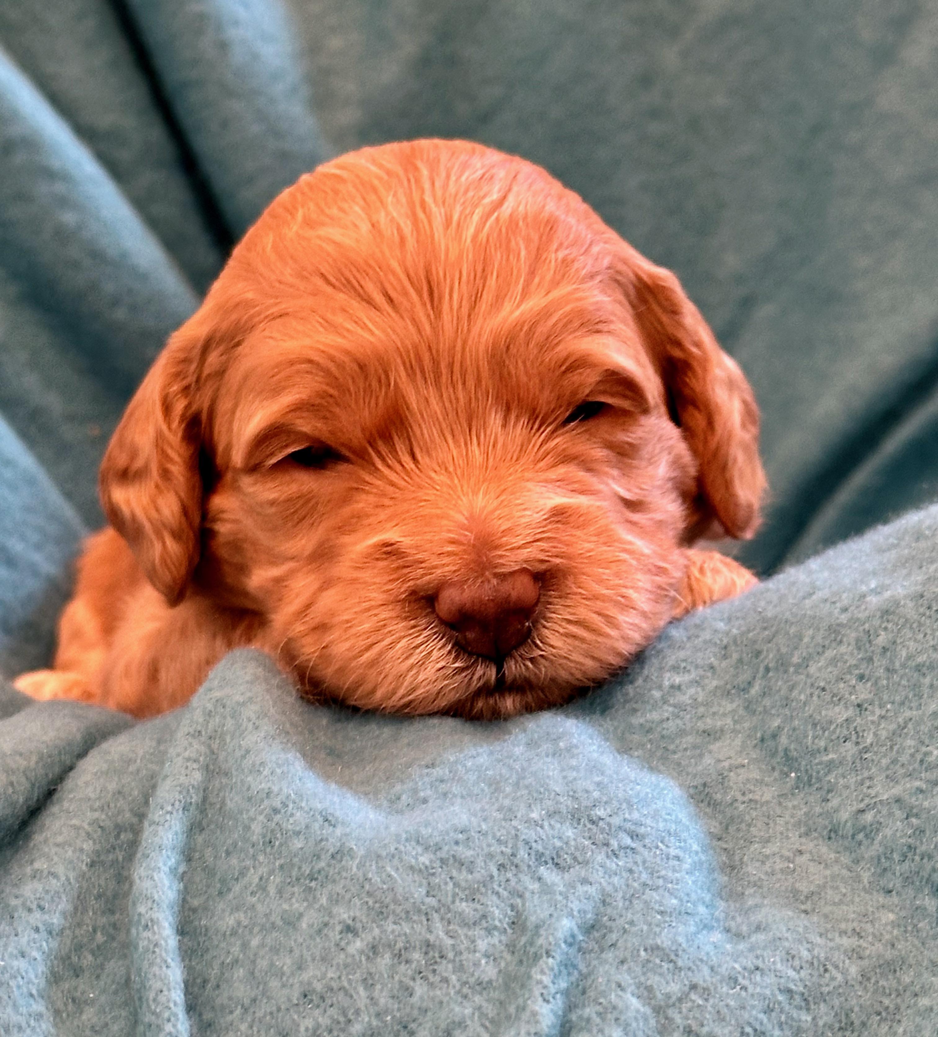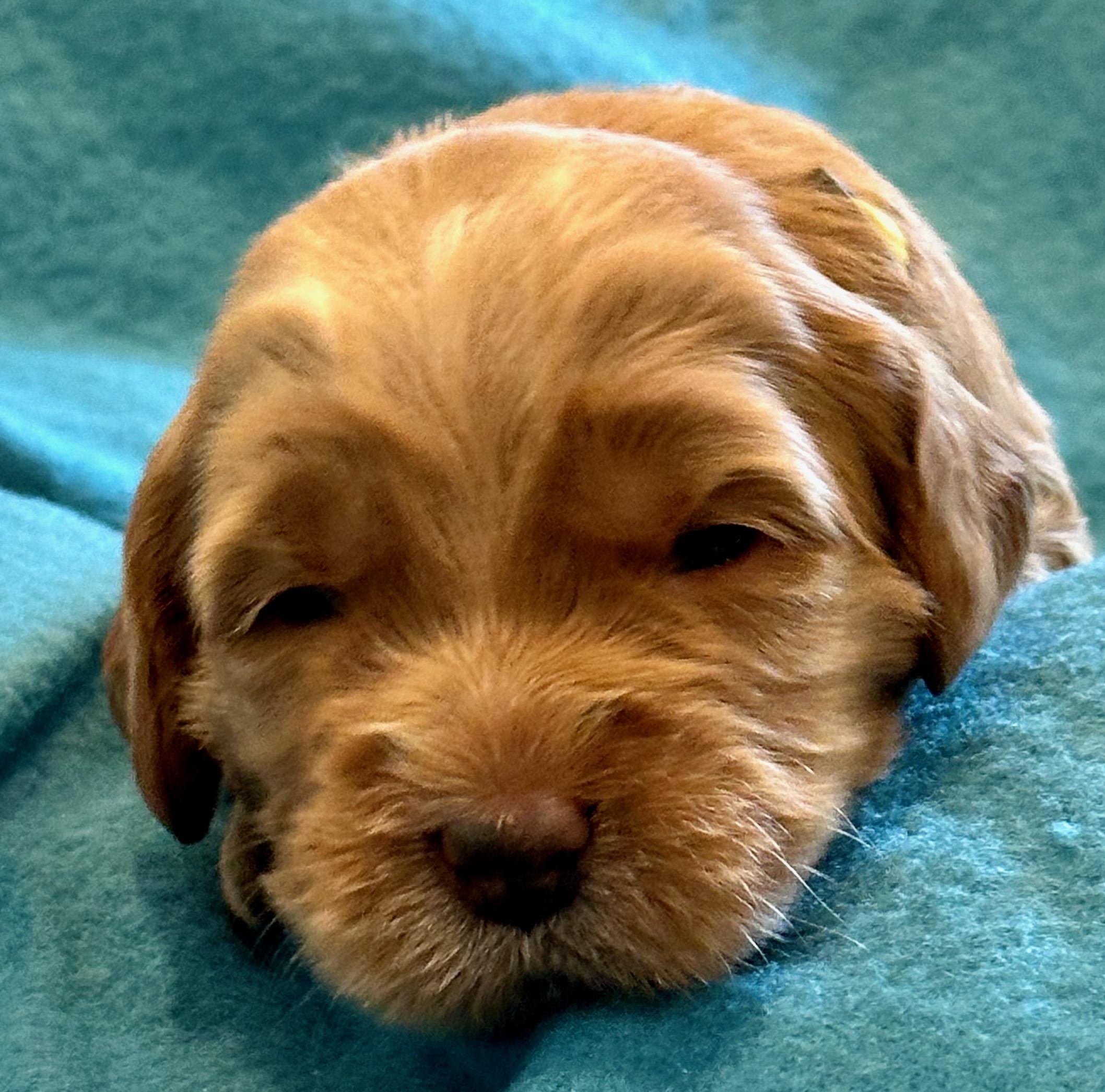 Everyone wants a dog like Rue! She's smart, sweet , and athletic with a warm, gentle personality and a gaze that melts your heart. She's cute as they come! Rue is our smallest with a wonderful red fleece non-shedding coat. Her kind and generous guardian family involve Rue in all of their activities from road trips to camping to playing at the beach. Rue’s family adore her affectionate, sweet personality.