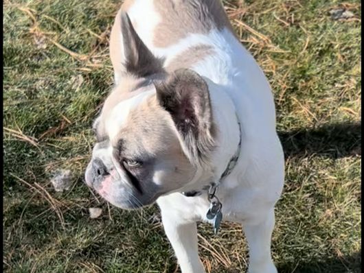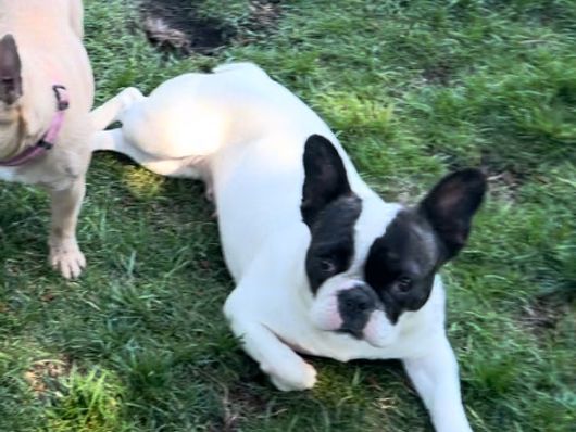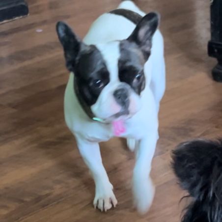 Stella is AKC registered. She’s a black-and-white pied French bulldog.