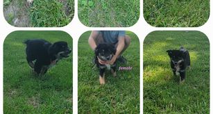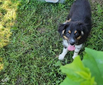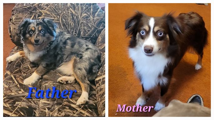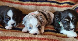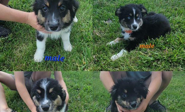 Our puppies include black tri, blue merle, and red tri. Colors will vary depending on the parent dogs.