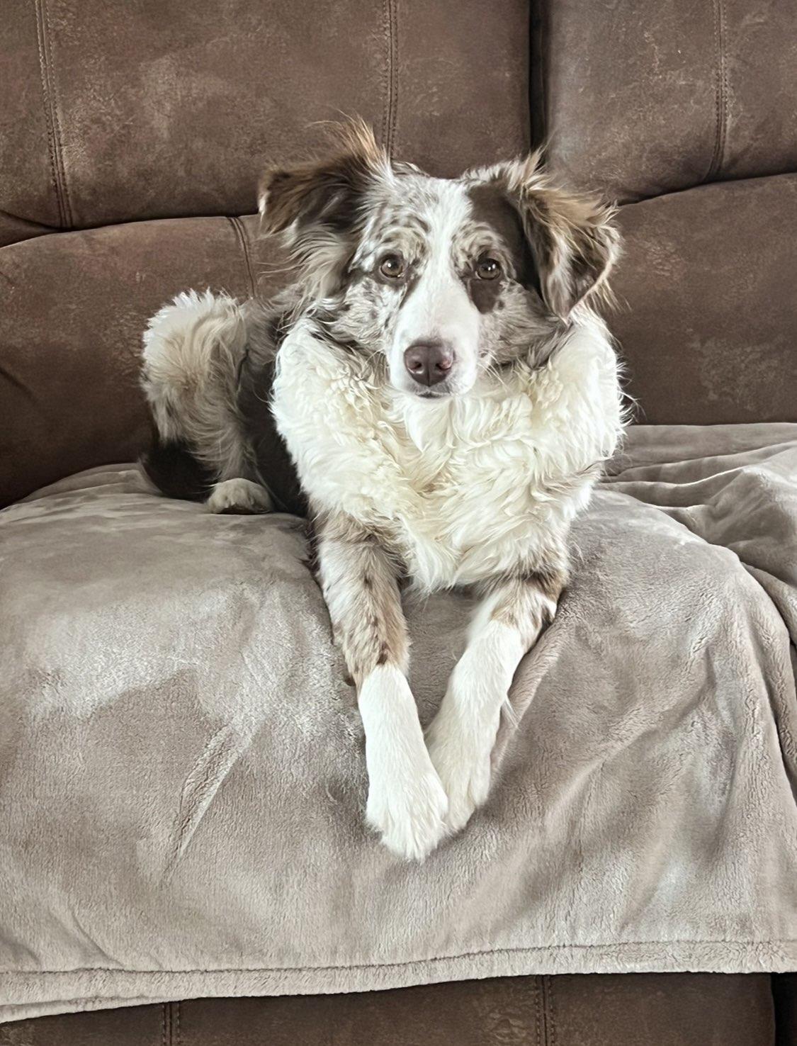 Luna is a stunning Blue Merle with dark brown highlights. She is a lovable, loyal dog who loves to play fetch. She is a gentle dog who loves everyone. She is great with kids.