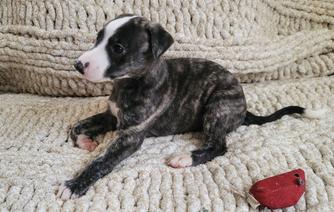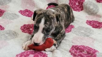 Our puppies include black brindle, red brindle, and white and black. Colors will vary depending on the parent dogs.