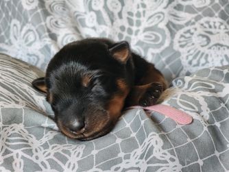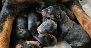 Our puppies include black and tan, black and rust, and harlequin. Colors will vary depending on the parent dogs.