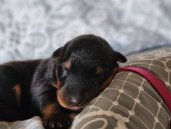 Cropping is an additional $500 and will cause the total puppy cost to become $3000. All puppies are the same price regardless of color and size. Each puppy comes microchipped, health checked by veterinarian, and vaccinated.”