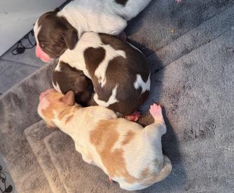 Brittany puppies include orange and white and liver and white. Colors will vary depending on the parent dogs.