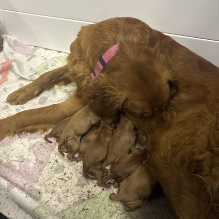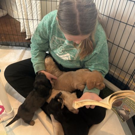 It's a full family thing. We are all involved every step of the way. Our dogs and puppies get lots of attention. Our puppies go home with a solid foundation of beginning training knowledge. We are here for lifetime support! We have a 2 year health guarantee that backs our puppies!