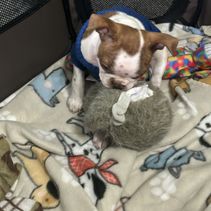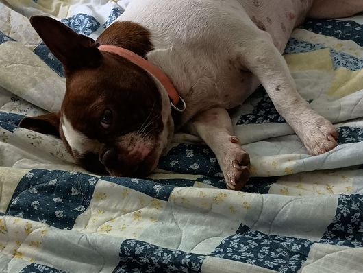 Patty Mae is a short stocky Boston terrier that is a white splash with red markings. She weighs approximately 20 lbs. She is very sweet and has the funniest personality. We had not originally planned on adding her to our breeding program but with her contagious personality that everyone falls in love with we decided to allow at least one litter. She is a very spoiled girl so I was worried how she would do with caring for babies but she has proven to be a pro.