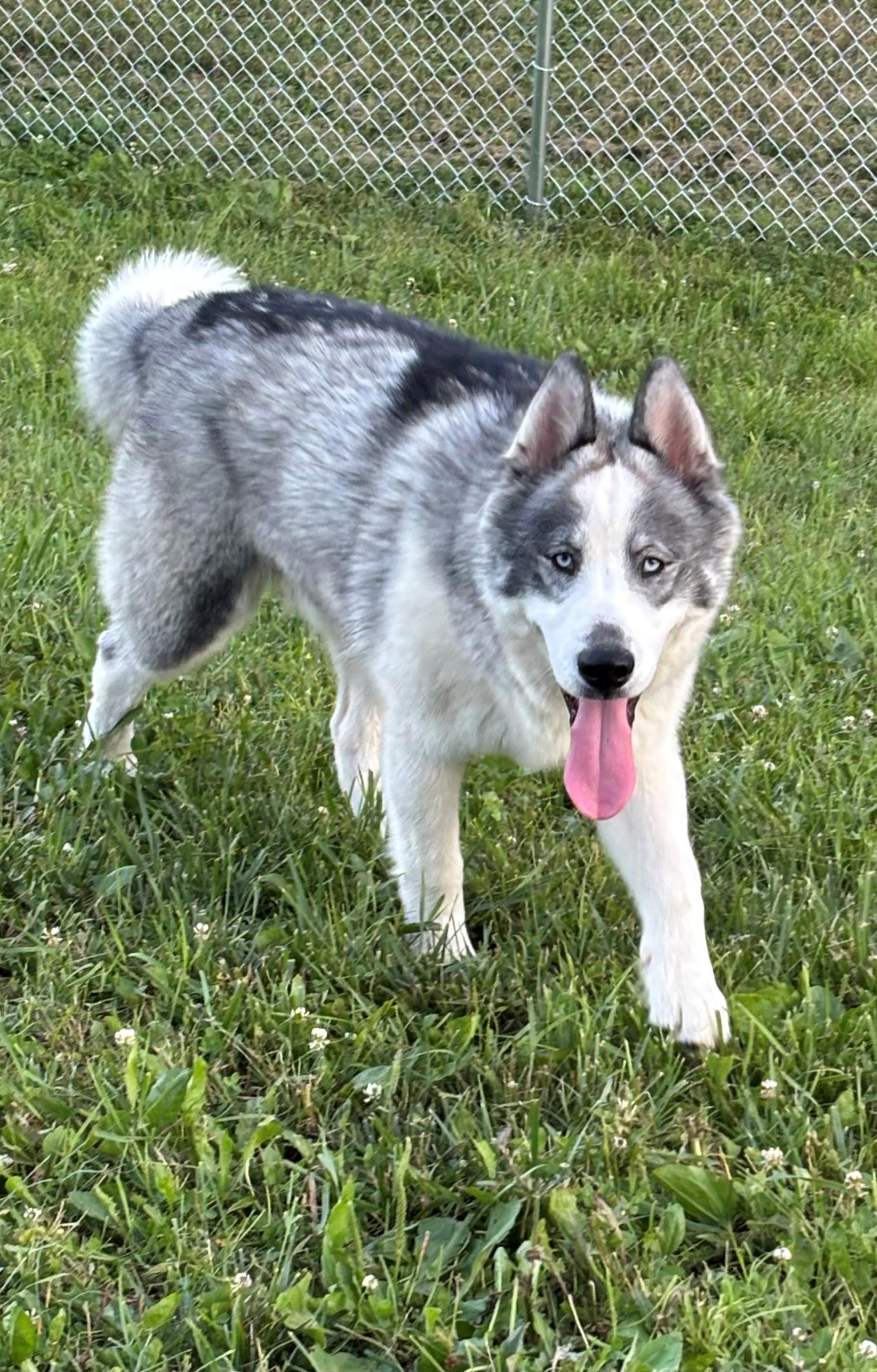 Quinner is the happy-go-lucky, high energy pack member of our 4-pack husky family. Uncharacteristic of huskies, Quinner takes on the role of guard dog, alerting us to approaching people and animals, but don't be alarmed - he loves all people! Quinner is bright, loves to play fetch with balls (especially soccer balls), and his special talent is catching tennis balls after a bounce or in mid-air. Quinner is blue-eyed and has a thick, soft coat and colors vary during the seasons going from very light grey and white to almost black and white. He has a fantastic appetite, is very curious, stubborn with what he wants, and is just happy all the time. Quinner enjoys the outdoors and indoors and prefers to be with another person or dog. He is the most talkative of the pack, but is not a howler. Quinner is AKC registered. DOB 11/09/2024.