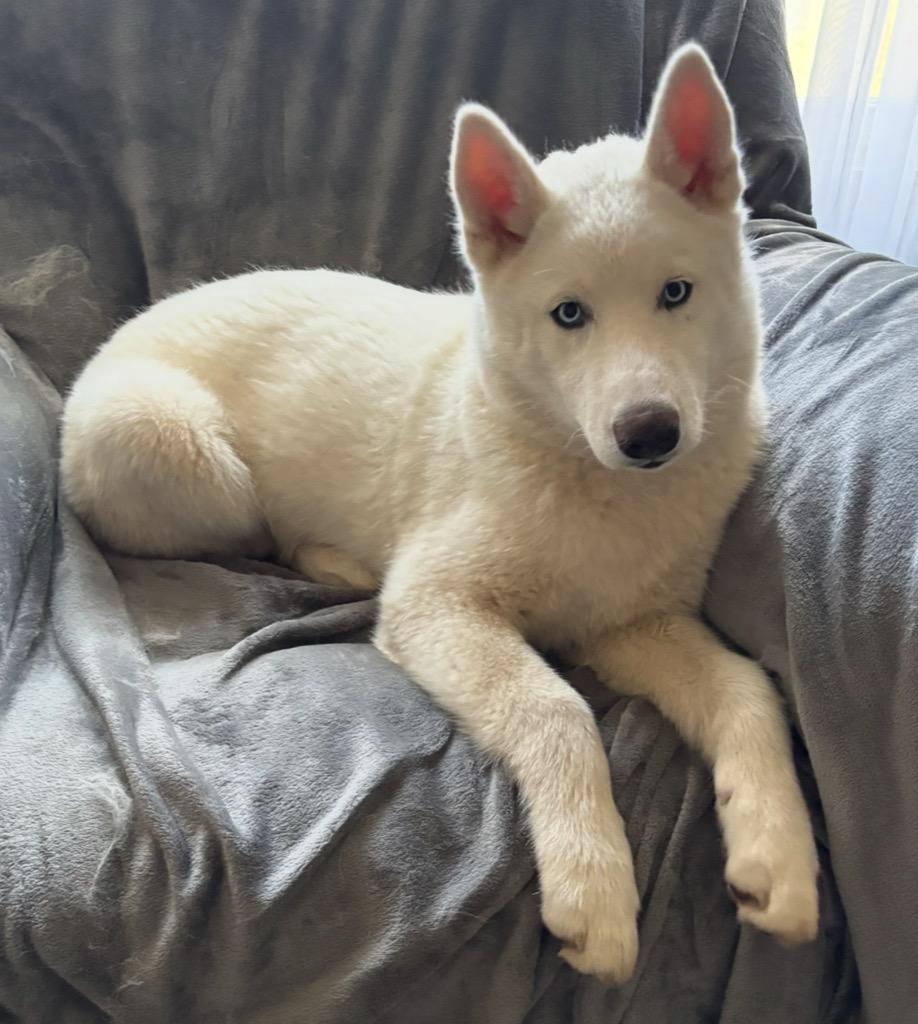 Jesse is our newest and youngest member of our pack. She is a very sweet girl that can still rough and tumble with the boys twice her size. Jesse is bright, curious, confident, independent, sweet, affectionate, and happy. Jesse's special talent is "sit" and "paw". Jesse is the quietest of the pack and rarely barks or talks. Jesse is fully white color with a thick, soft coat, blue eyed, and has a half pink-half black nose. She is AKC registered, DOB 04/28/2025