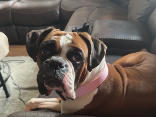 Aurora is a female Boxer. Carefully selected as a great representative of her breed, Katie decided to make her part of their program. Katie has passed Good Dog’s screening process, which involved a review of their breeding practices, environment, and the mental and physical health of their dogs.