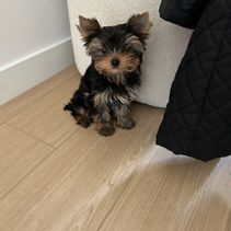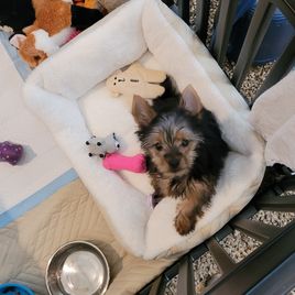 Karen was awesome. Suki was born 11/22/24. She was totally pee pad trained when I picked her up Valentines Day. She has adjusted well to our 12 year old male yorkie and he's being like a big brother. Her disposit