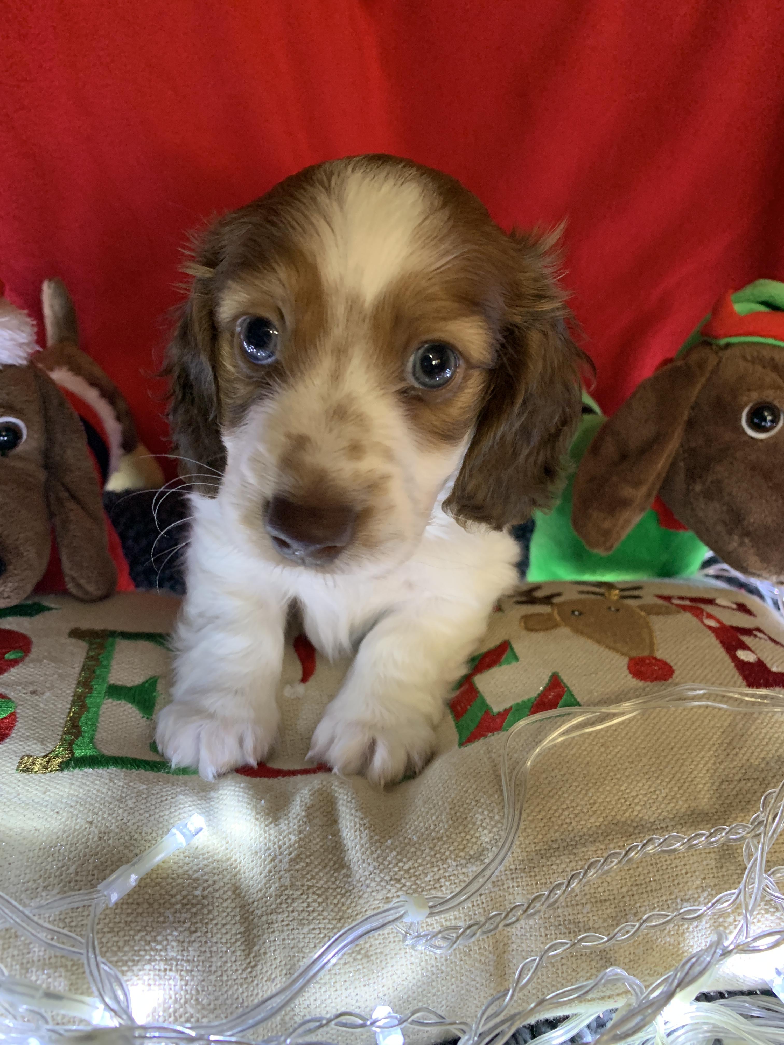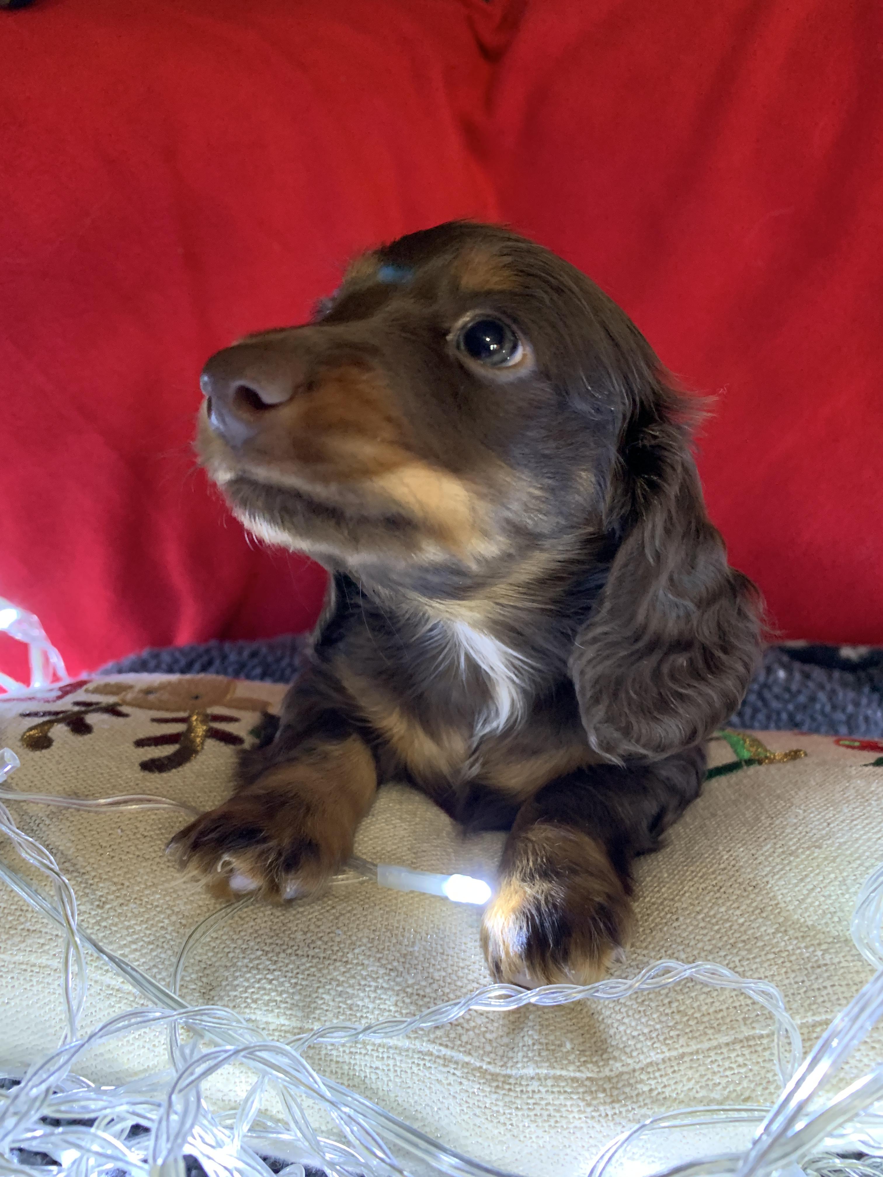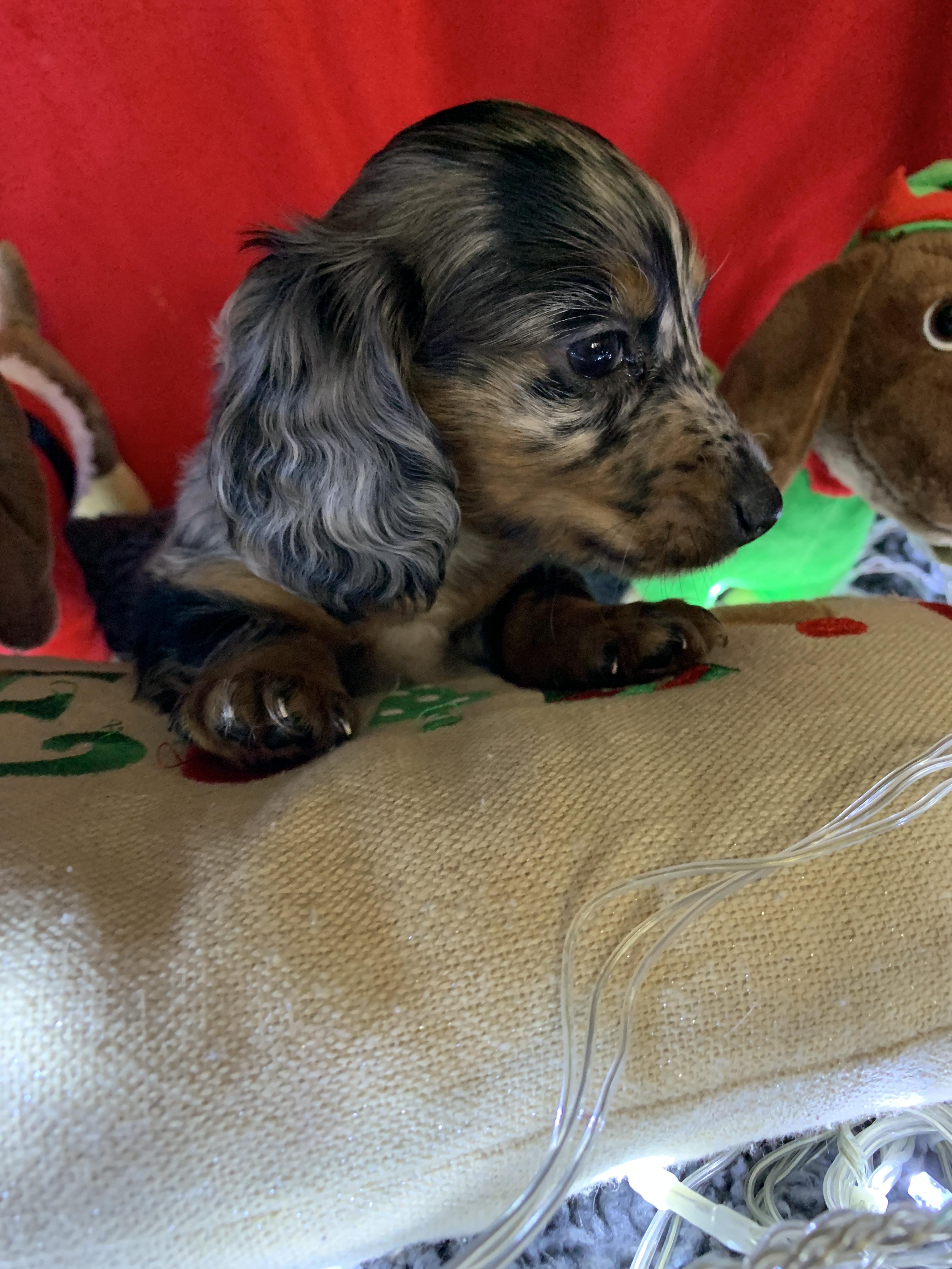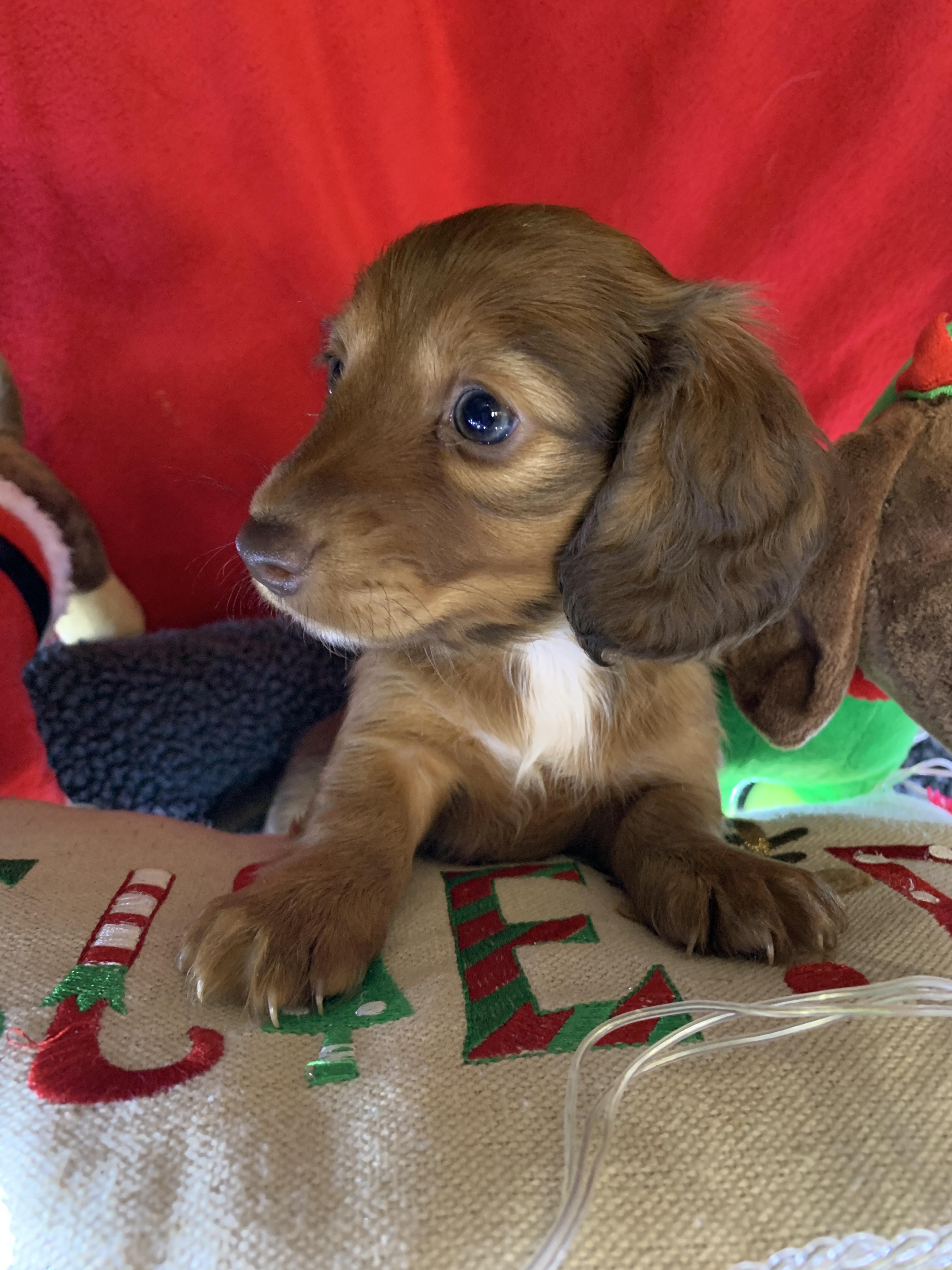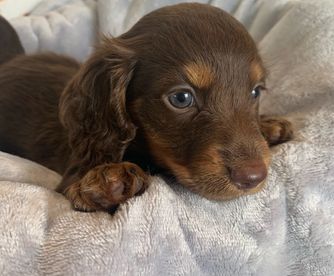 I'm Angela H., the breeder behind Hocomo Hollow Doxies located in Caulfield, MO. We cherish each of our dogs and puppies, and we do everything we can to make sure that they get the best lives possible. That includes everything from choosing healthy parents with good temperaments, to proper socialization and daily care, to placing them in loving homes with wonderful families.