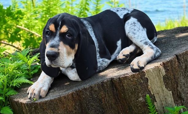 Our Bluetick Coonhound puppies are blue ticked and tan. Colors will vary depending on the parent dogs.