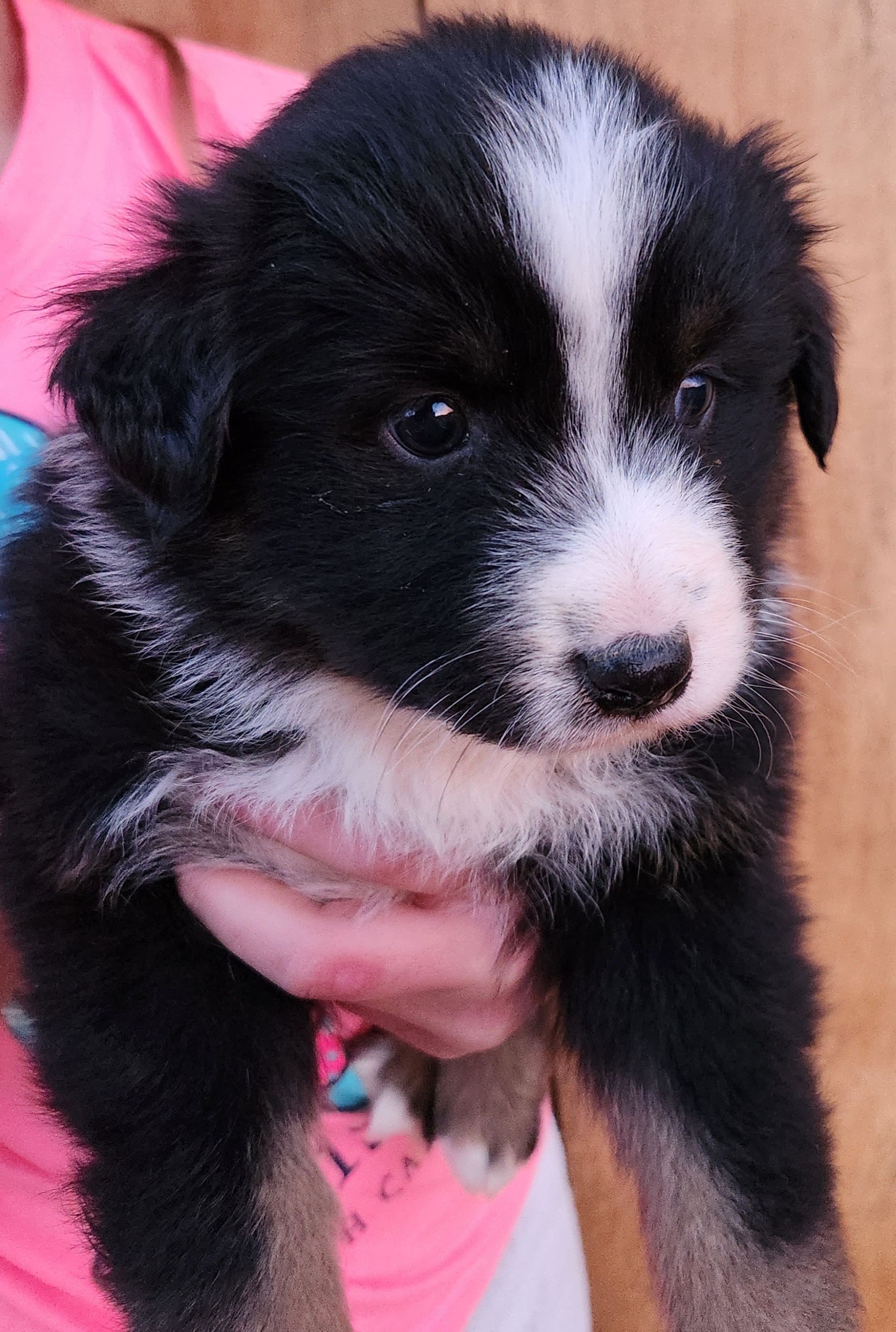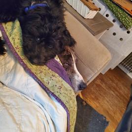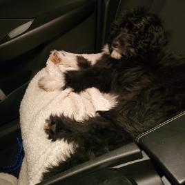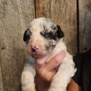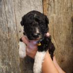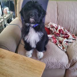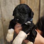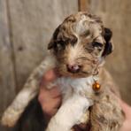 I couldn't ask for a better addition to our family. Since June, I have had to put three of my four dogs down due to old age. Quinn Bee (the only dog left) and I were not doing well without them. It was too quiet. After a fiasco trying to adopt a stray and the trauma of going through that ordeal, I decided to try a breeder. After extensive research and considering that I have neighbors with young children, I decided an Aussiedoodle would be a great fit. It's been two weeks now, and I couldn't imagine our lives without him. Augustus is a ball of energy, goofy, smart, quick learning, and loves cuddles. His fur is sooo soft, and his markings make it look like he is wearing a tuxedo with a plume shirt. He loves the snow, zooming around the backyard, playing fetch, and spending time with his big sister. He also took the 6 hr drive home like a champ. He would sit in my mom's arms or lie down in the back and play with his new toy. Morgan was the first to respond to my inquiry. She was responsive and was able to answer my questions. The pictures and video she sent me captured August's personality. I will definitely consider getting another puppy from her when the time comes.