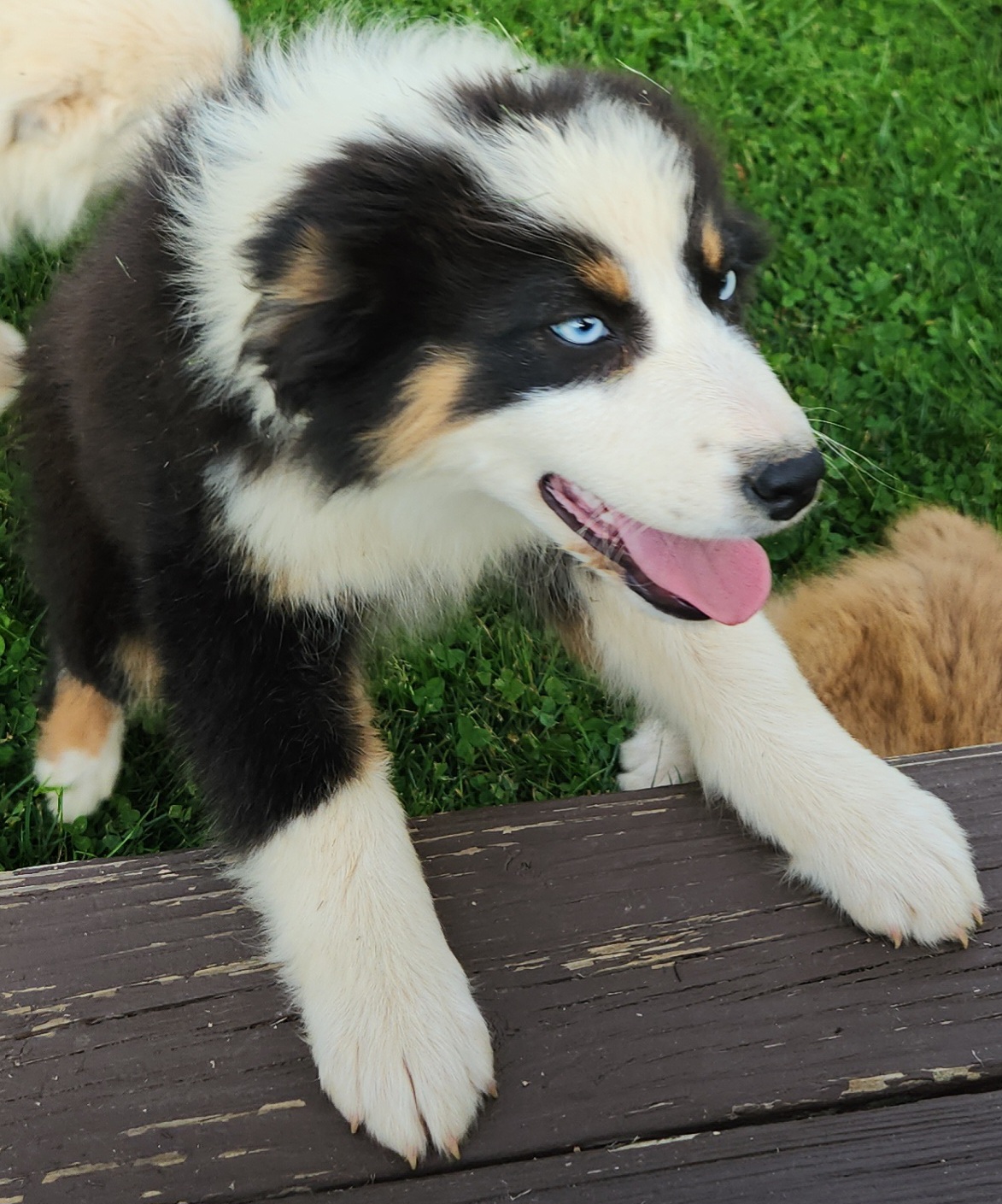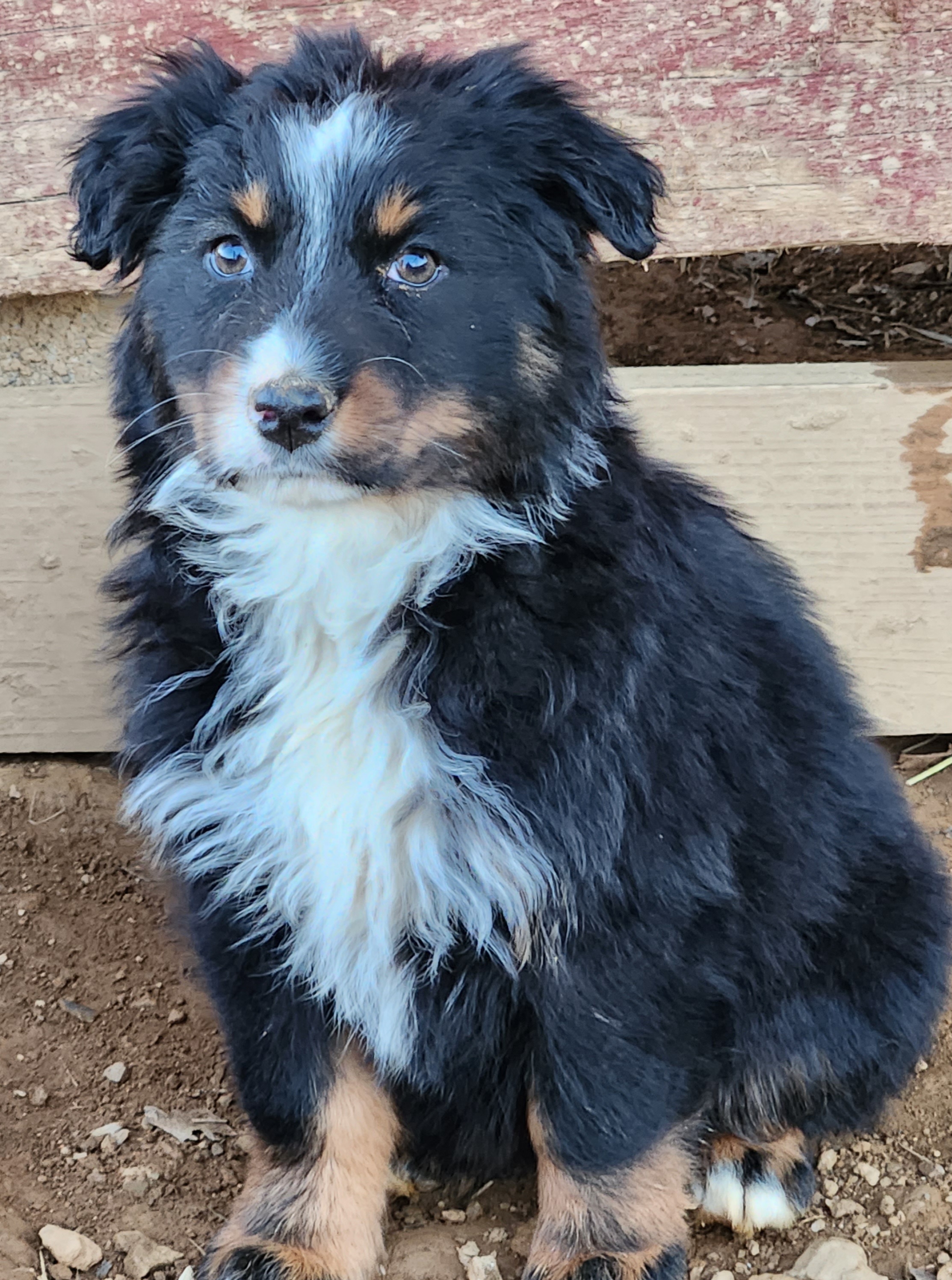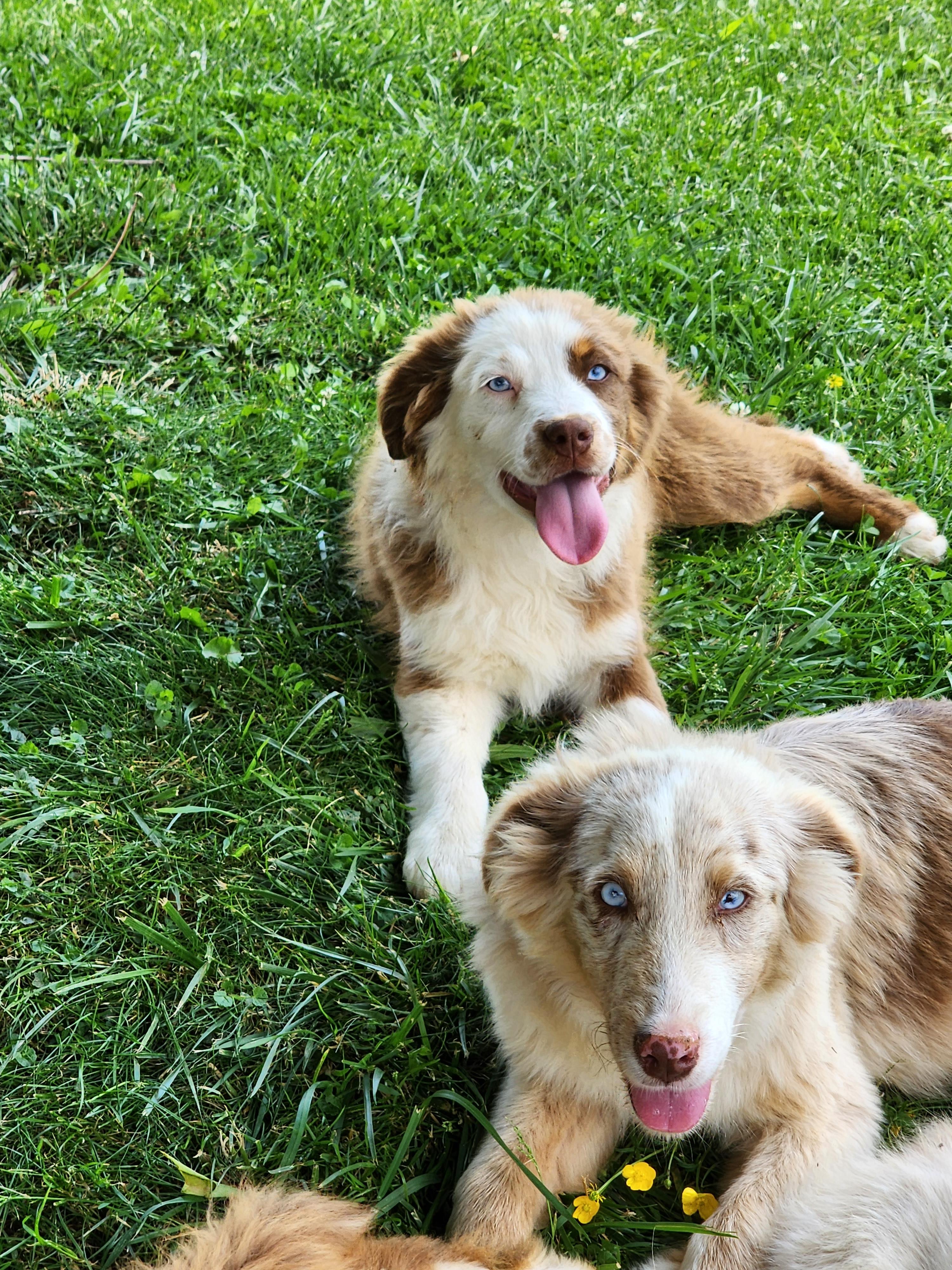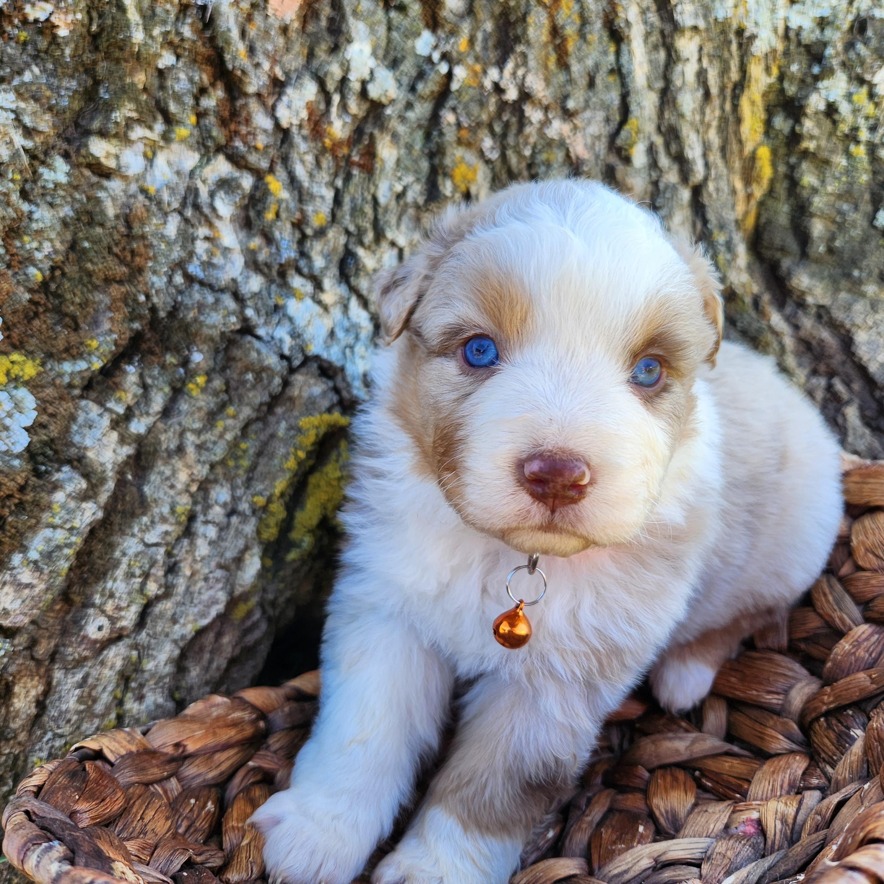 Our Aussiedoodle puppies include sable, blue merle, red merle, and black tri-color. Australian Shepherd puppies include red merle, blue merle, red, black tri-color, and red tri-color. Pembroke Welsh Corgi puppies include sable and white and black. Colors will vary depending on the parent dogs.