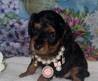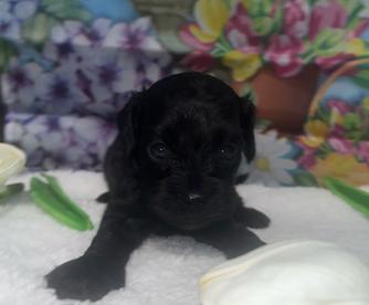 Our Cavalier King Charles Spaniel puppies are black and tan. Cavapoo puppies include black and white, red, black and tan, and black. Colors will vary depending on the parent dogs.