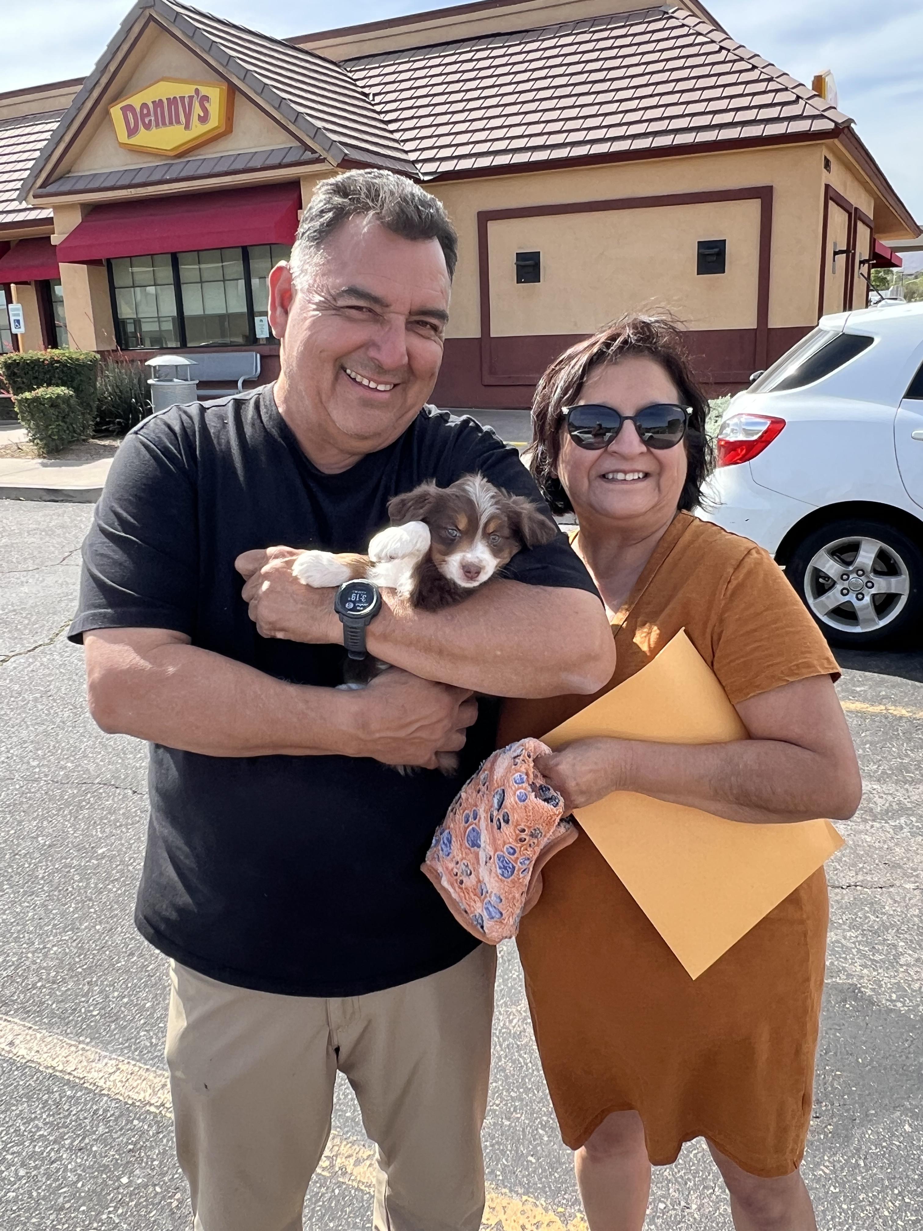 It was a pleasure meeting her and her husband, Mac. The helped us by getting ready for Ronnie’s long ride home to Tucson. They gave us a towel and doggy pads which we hadn’t brought and fed her a light breakfast for the trip. She never once got sick and slept most of the way home. I’d recommend getting a dog from Hilary and Mac. They’re the best!!