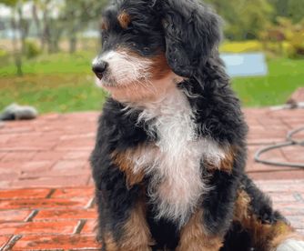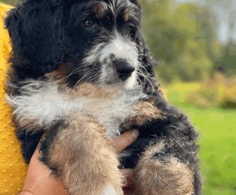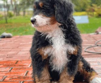 Our Bernedoodle puppies include sable, black and white, and tri-color. Goldendoodle puppies include apricot and parti. Colors will vary depending on the parent dogs.