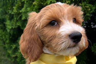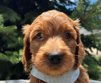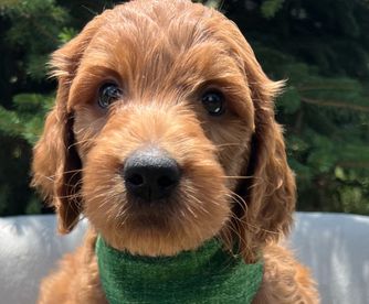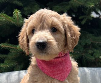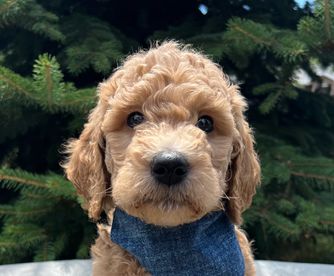 Our Goldendoodle puppies include cream, apricot, red, and parti. Colors will vary depending on the parent dogs.