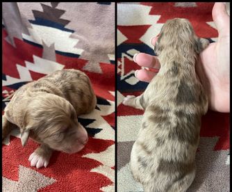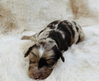 Our Aussiedoodle puppies include blue merle, red merle, black phantom, black tri-color, red phantom, and red tri-color. Australian Shepherd puppies include red merle, blue merle, black tri-color, and red tri-color. Colors will vary depending on the parent dogs.