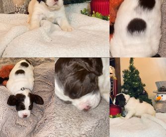 Our puppies include white and liver, white and black, liver white and tan, liver and white, black white and tan, and black and white. Colors will vary depending on the parent dogs.