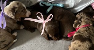 Our puppies include piebald, red, chocolate, fawn (isabella), fawn (isabella) and tan, chocolate and tan, and dapple. Colors will vary depending on the parent dogs.