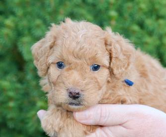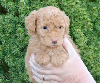 Maui is a small moyen red poodle. He carries hidden merle which produces gorgeous merle coats and blue eyes in some of his offspring. He is simply one of the most loving dogs in our family. The temperaments in his puppies are top notch! He lives with our youngest daughter.