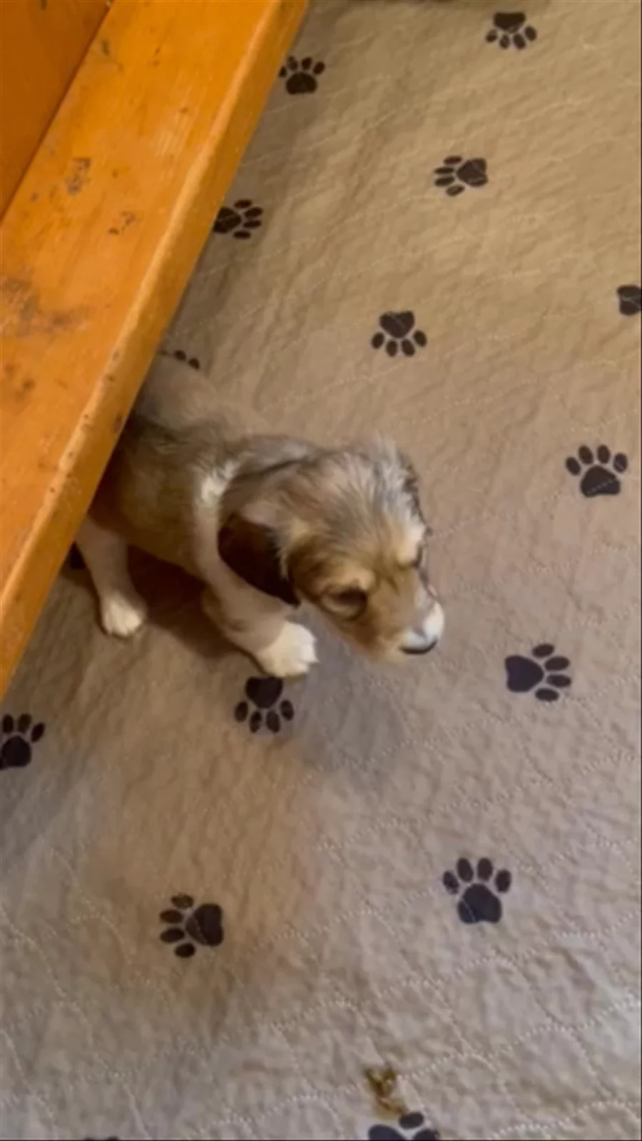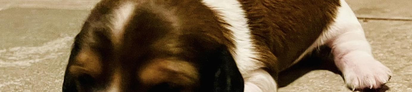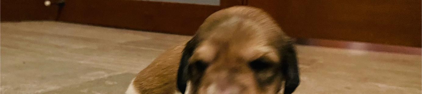 Calla & Rye Pups. Piebald boy tall white legs is looking for his family