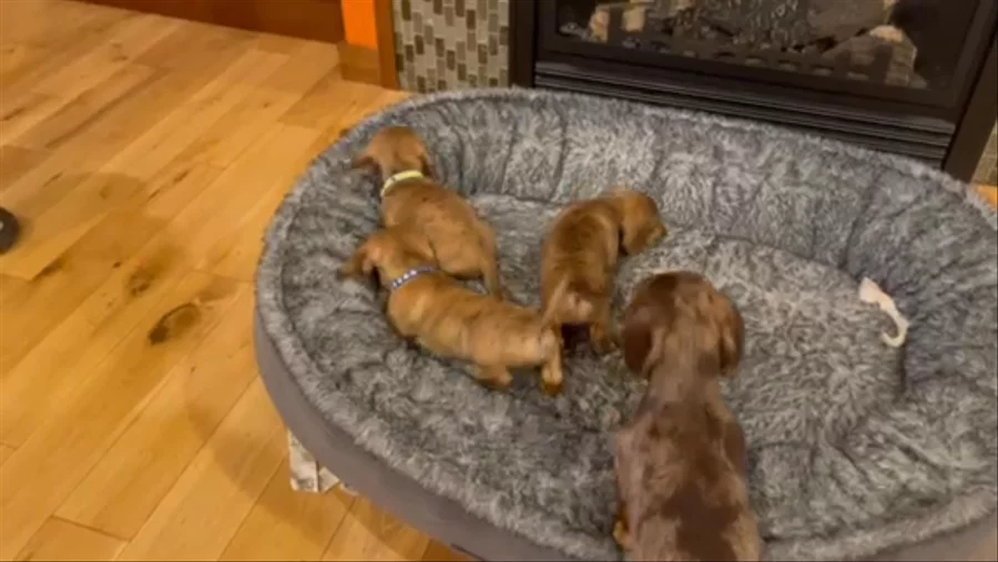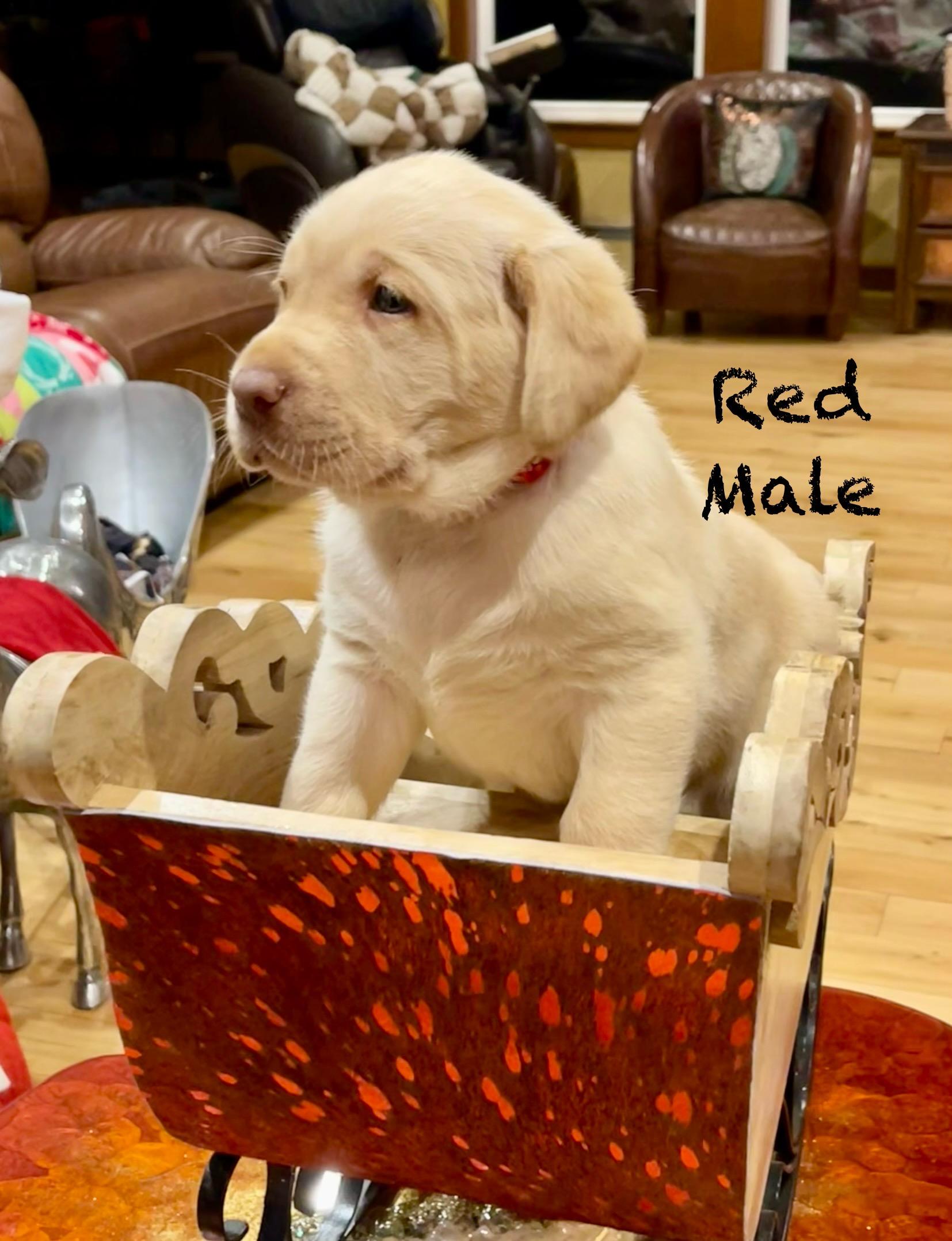 Red collar is the largest puppy from this litter. He plays well with all the other dogs and also will chill playing with a toy