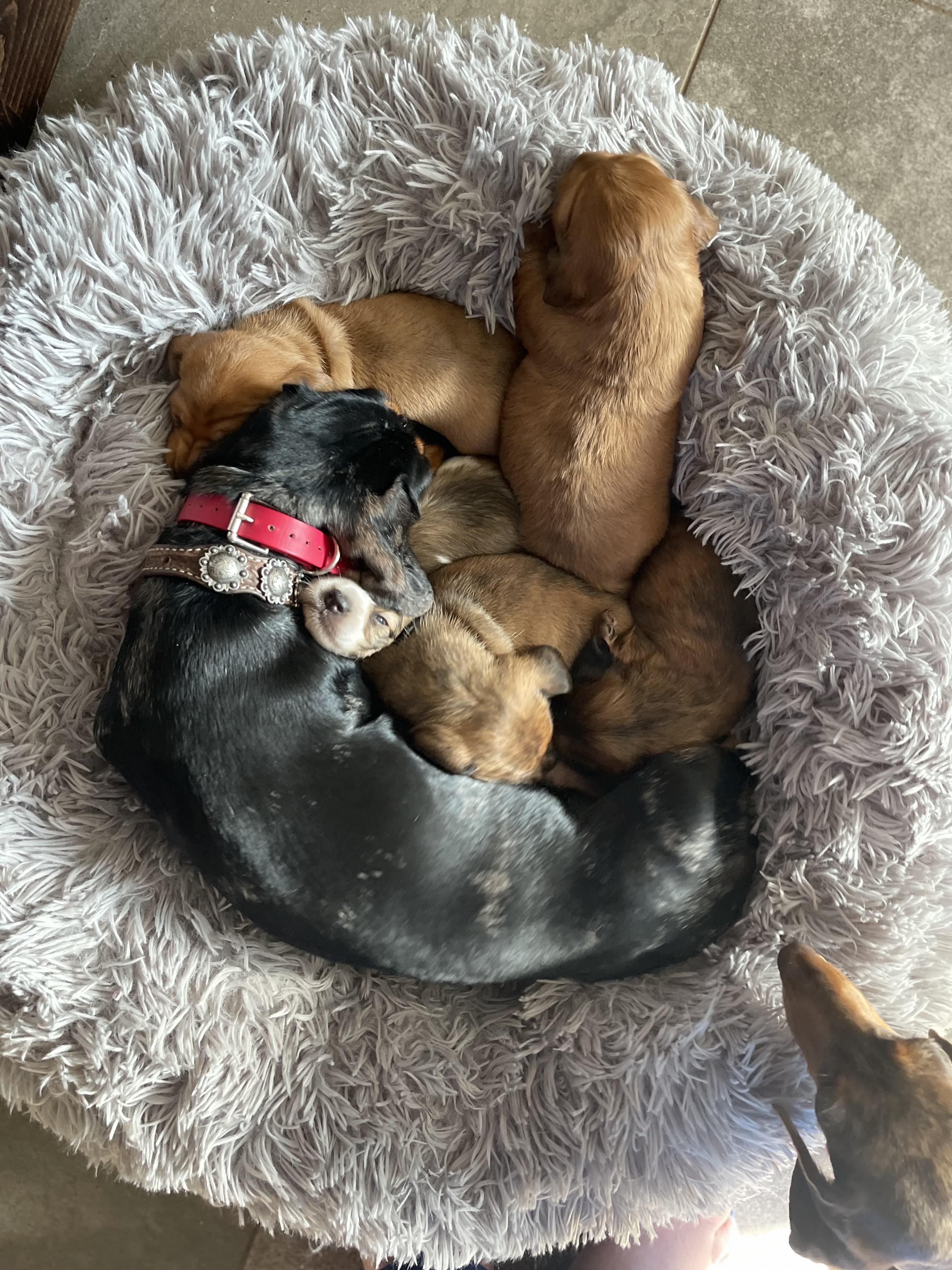 Calla ‘s pups a just a couple of days over 4 weeks old. They get to go to their forever homes Jan 8, 2026