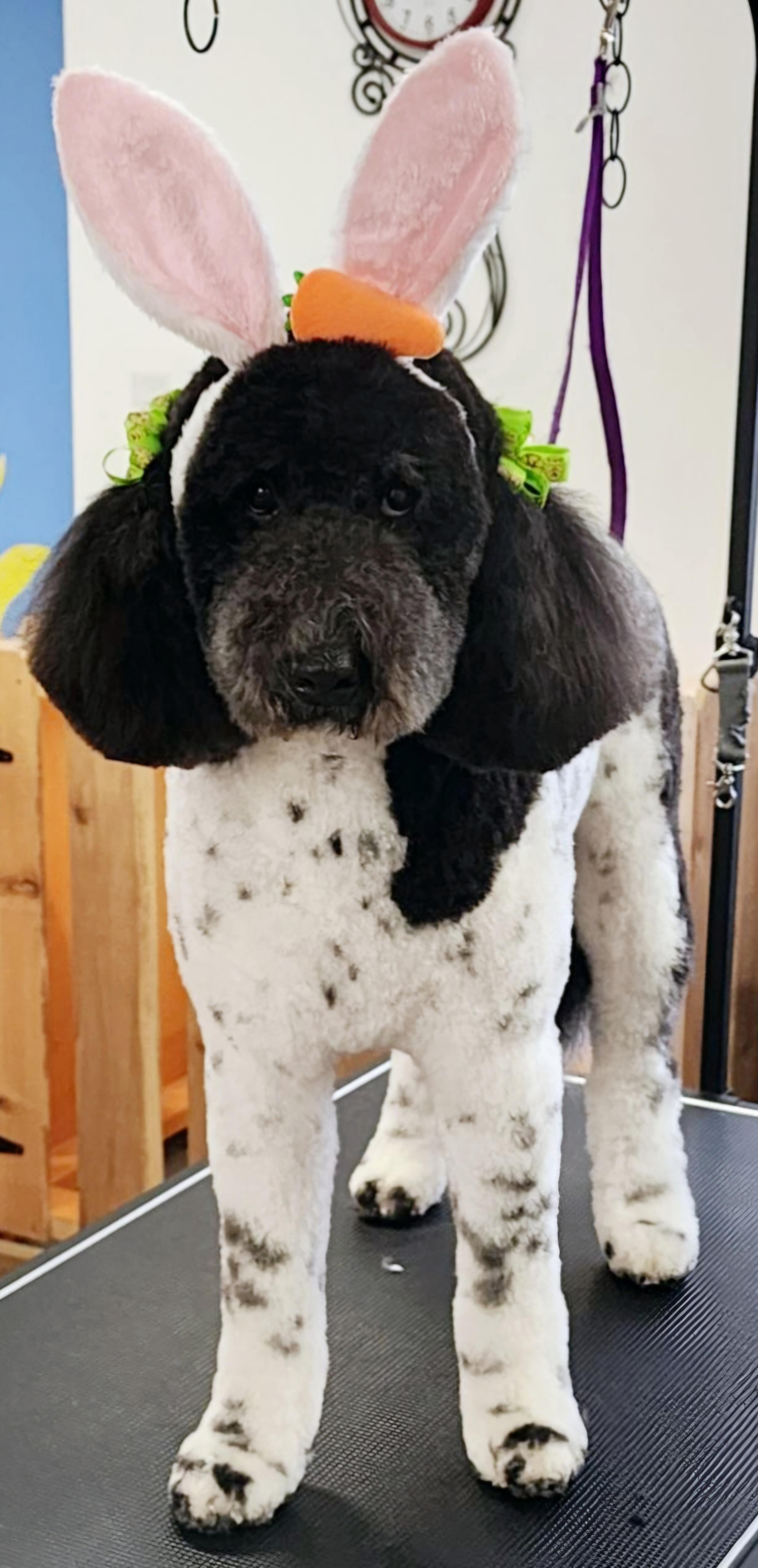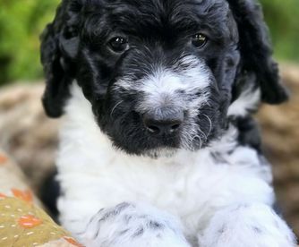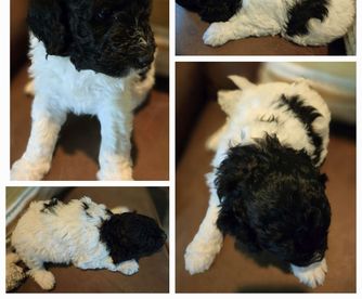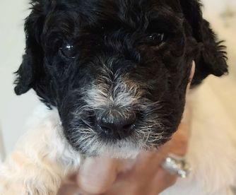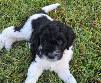 Georgie is an F1B black and white parti doodle. She comes from a white English Cream mother and father, a AKC/CKC Café Ole parti register standard poodle.