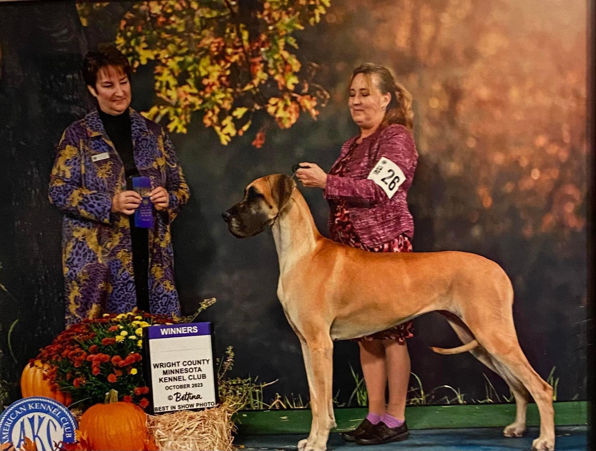 In 2002, I took my youngest son to the pet store to buy a hamster. I met a couple there that were shopping with their two Great Danes. I instantly fell in love with the breed. After a few years of getting my own, I discovered dog shows. What a joy to be able to show off my dogs! After a few years out of the show world, I recently started showing again and now have 3 championships under my belt.