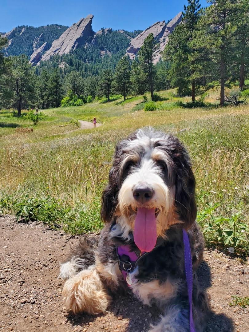 Jolee lives across town with her guardian family and spends her free time flopping on her guardian kiddos, chasing squirrels and enjoying belly rubs. She is loving, happy, snuggly, and extra-gentle with kids. She has been thoroughly health tested and is clear of all Poodle and Bernese Mt. Dog genetic mutations. She also has passing OFA scores for her elbows, patellas, and heart and an excellent score for hips, a rare find for a larger bernedoodle. Jolee has a wavy, low-shedding coat with classic Bernese Mountain Dog markings.