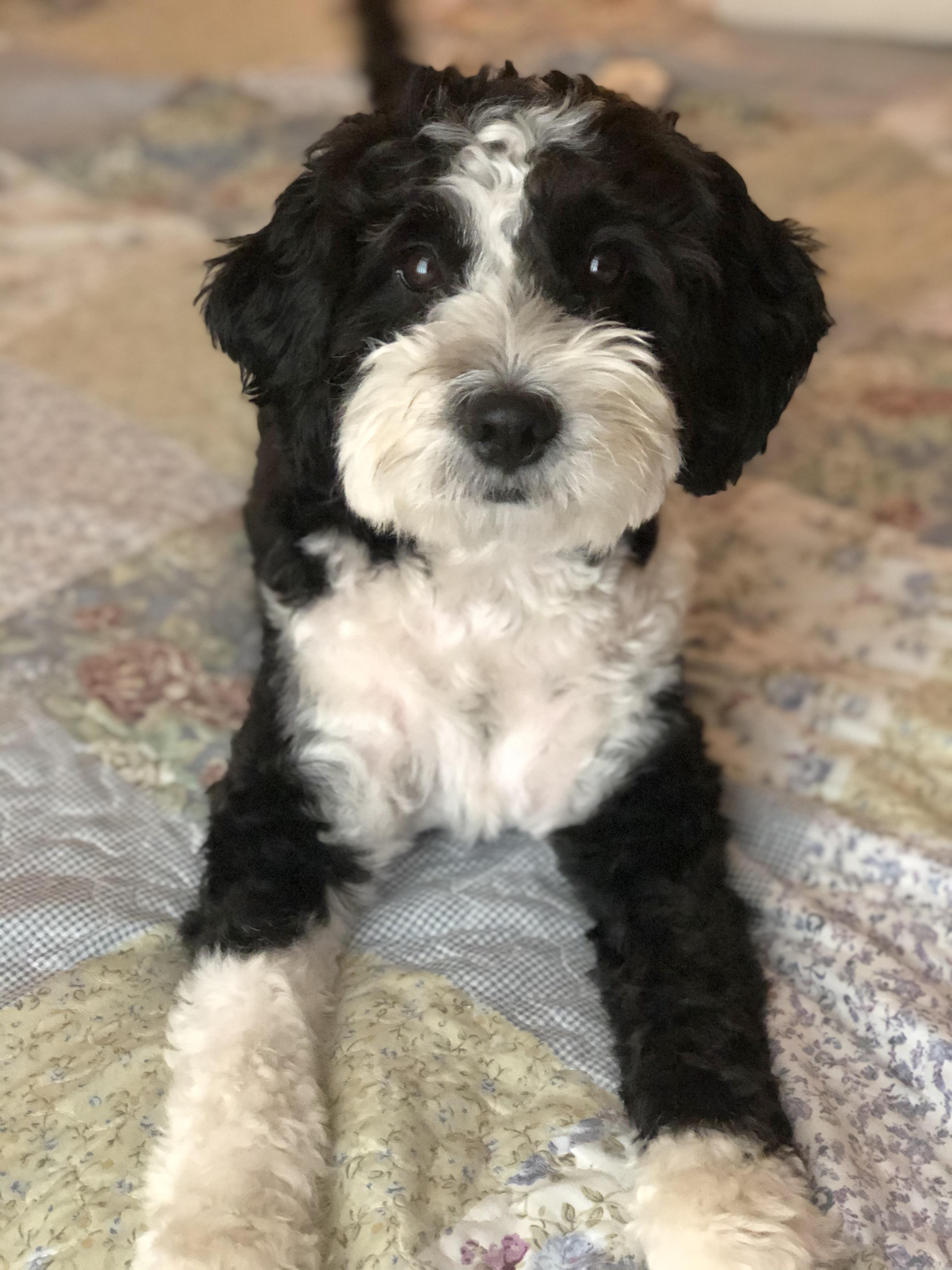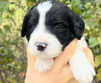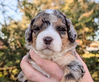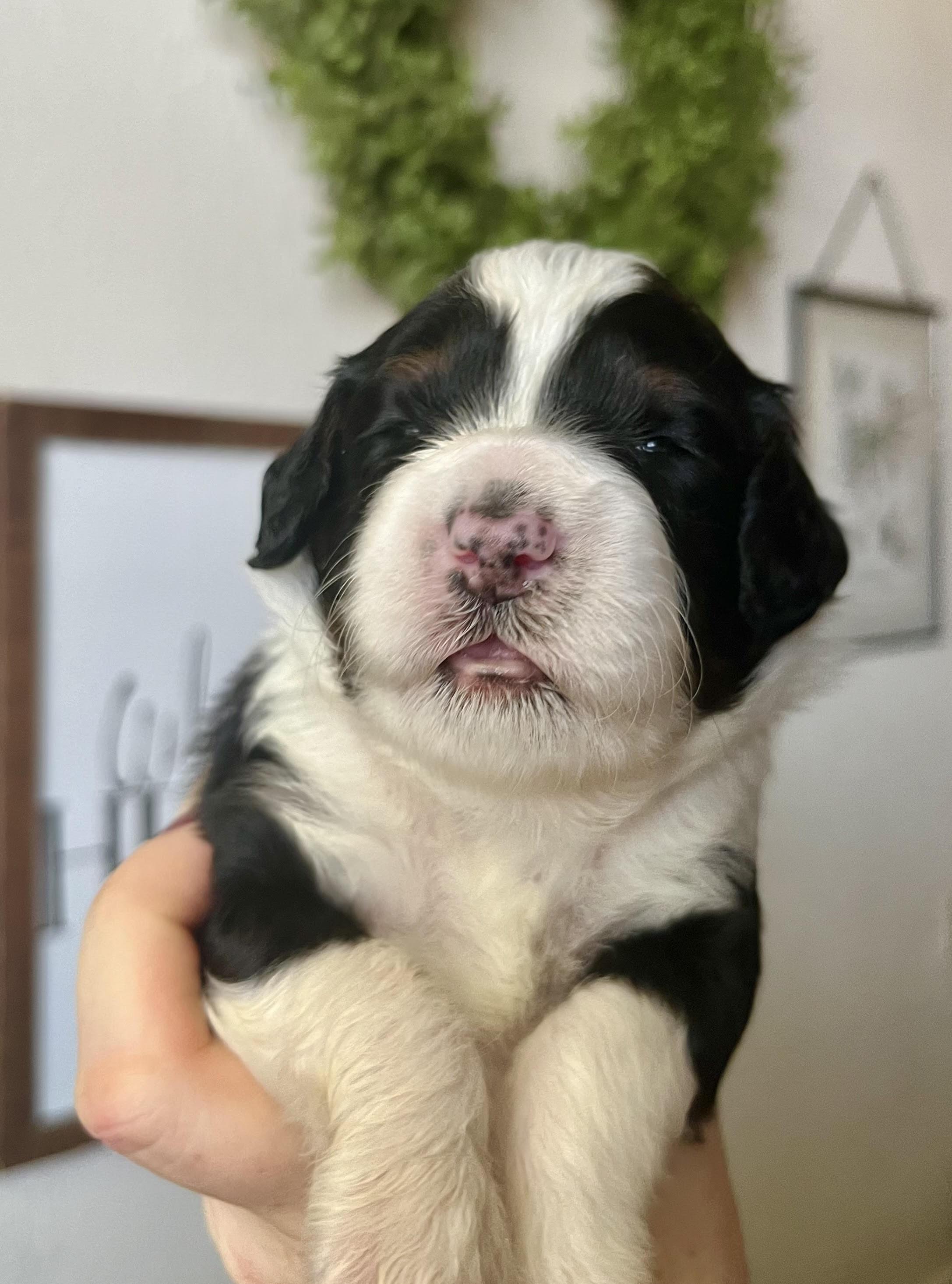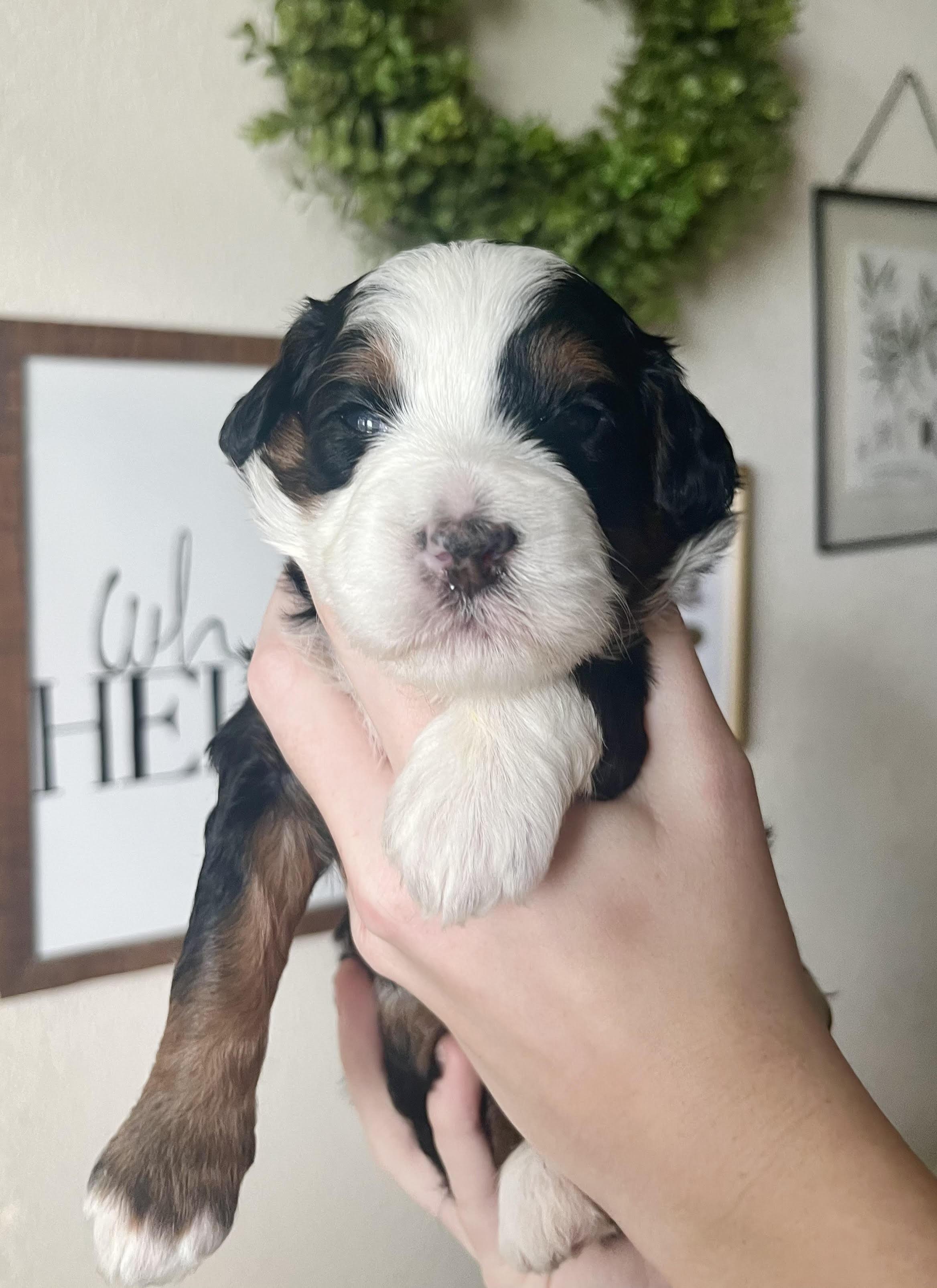 Our Bernedoodle puppies include black and white and tri-color. Colors will vary depending on the parent dogs.