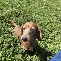 Delta has a calm nature and is the definition of a cuddle bug. She is a beautiful short-haired red dapple mini that loves car rides and being by your side everywhere you go.