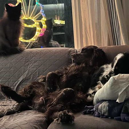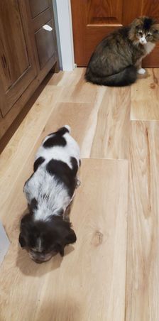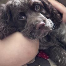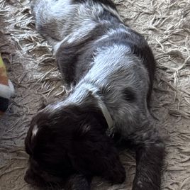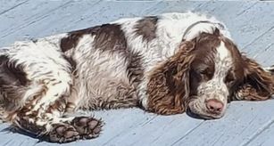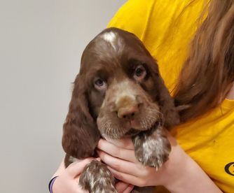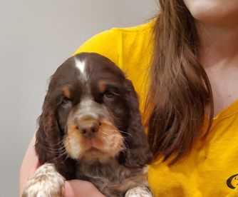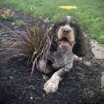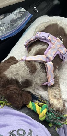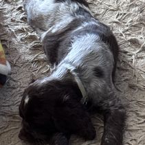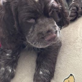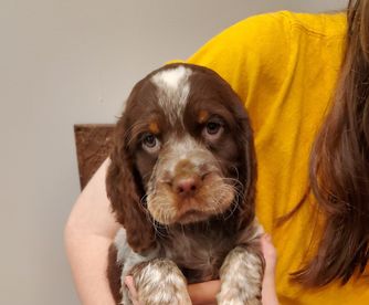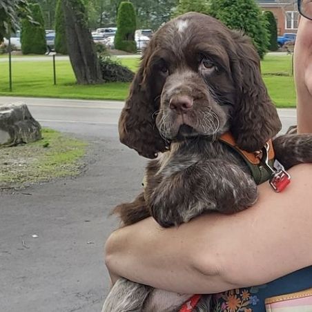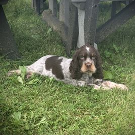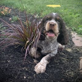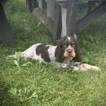 Brenna is our 2nd Springer, we absolutely love this breed!! Brenna is Liver, White and Roan. Brenna has been a great addition to our family. She gets along great with kids, other dogs and our cat. Brenna loves agility training and scent games, she is very eager to please. Brenna is AKC registered and Embark health tested. Brenna is fed dog food along with raw treats.